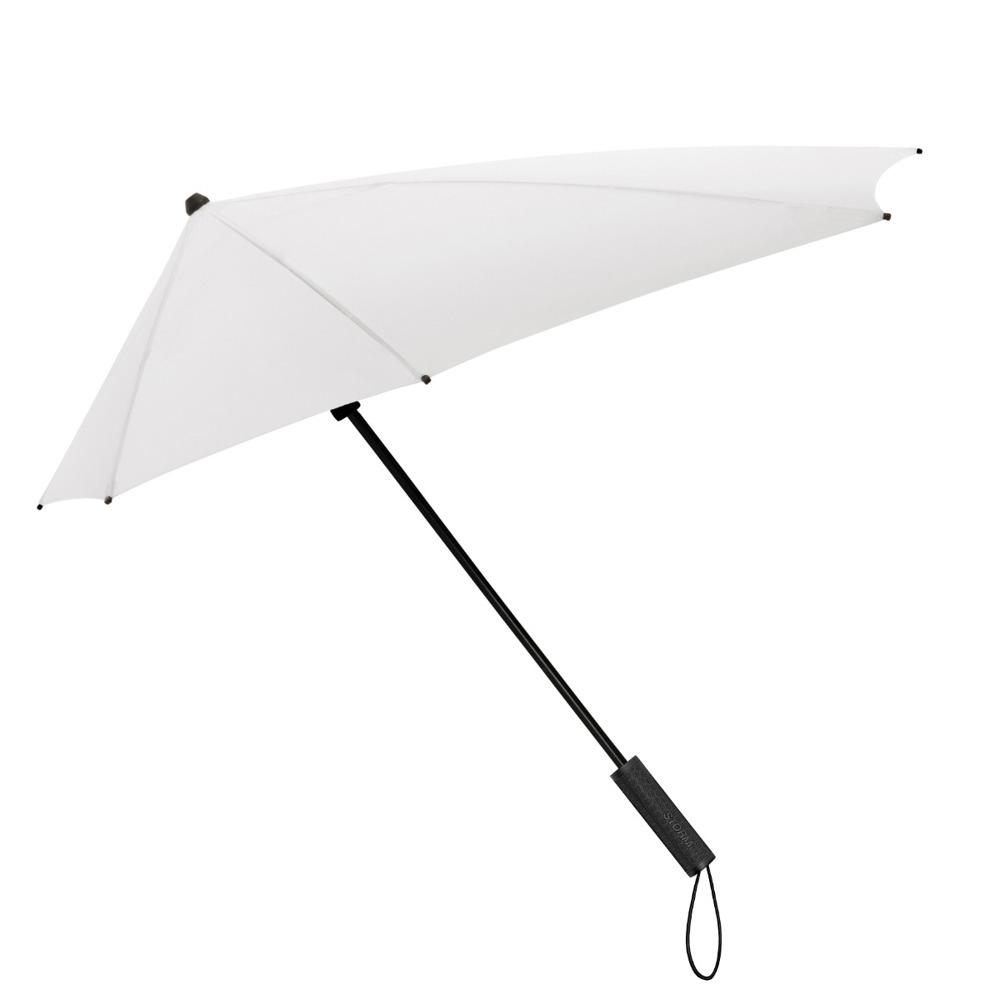 De aërodynamische stormparaplu met de brede achterkant voor maximale bescherming tegen regen..