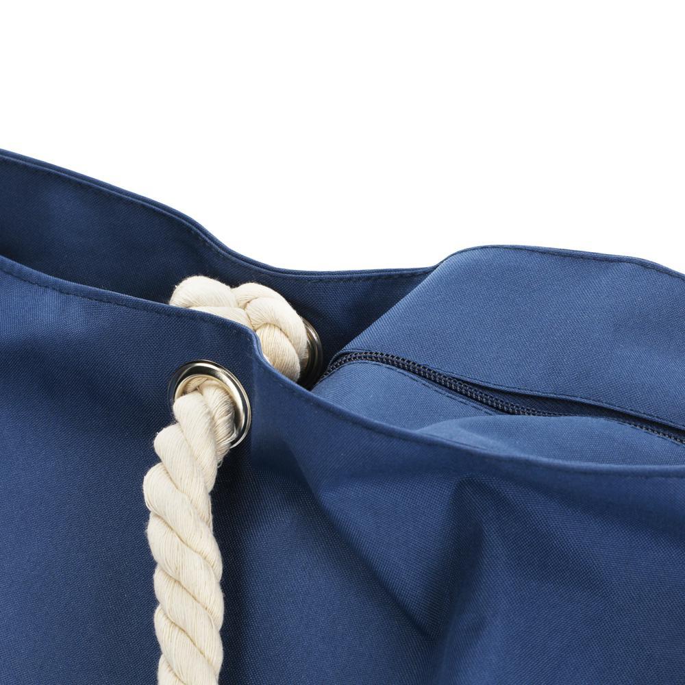 Ontdek deze stevige polyester strandtas met pvc-binnenvoering, ideaal als gepersonaliseerd relatiegeschenk. Je krijgt twee robuuste draaghengsels van dik katoenkoord met 15 mm diameter en metalen ogen voor extra duurzaamheid. De tas en het ingenaaide binnenzakje sluiten je veilig af met een ritssluiting inclusief trekker. Dankzij de brede bodem vul je 'm ruim met spullen.