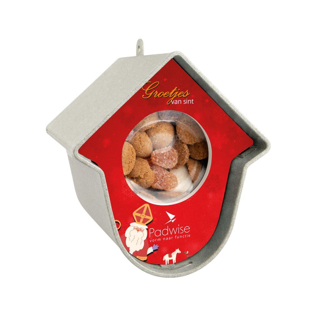 Het Strooigoedhuisje Evie is jouw perfecte duurzame relatiegeschenk, gemaakt van gerecycled materiaal en gevuld met circa 140 gram smakelijk strooigoed. Met full colour logobedrukking op de voorzijde steel je de show op events en promoties.