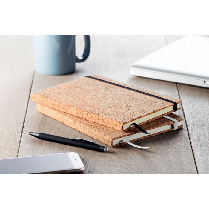 A5 notitieboek met harde kurken kaft. Ingebonden. 192 pagina's gerecycled papier (96 vellen). Elastische sluitingsband, bladwijzer met lint en elastische penhouder. Kurk is een natuurlijk materiaal. Door de structurele aard en de porositeit van het materiaal kan het uiteindelijke drukresultaat per item afwijkingen vertonen.