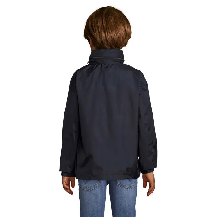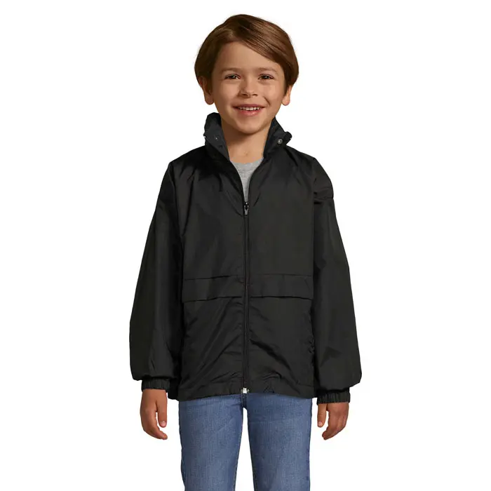Dankzij de ritssluiting, opgevouwen kap in de kraag en twee buitenzakken met rits, is hij praktisch en gebruiksvriendelijk. De opvouwbare functie in een handzaam zakje met elastiek rond de taille maakt hem eenvoudig mee te nemen – perfect voor actieve kids tijdens uw bedrijfsuitjes.