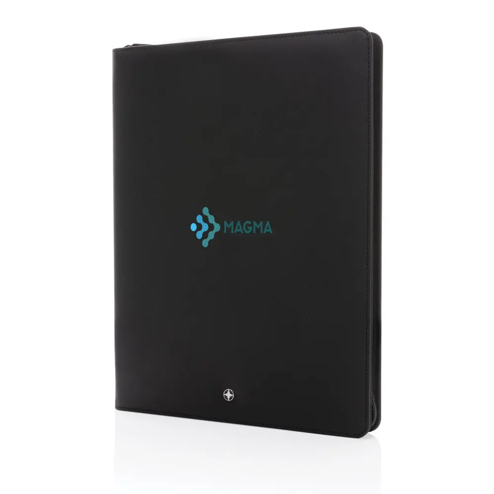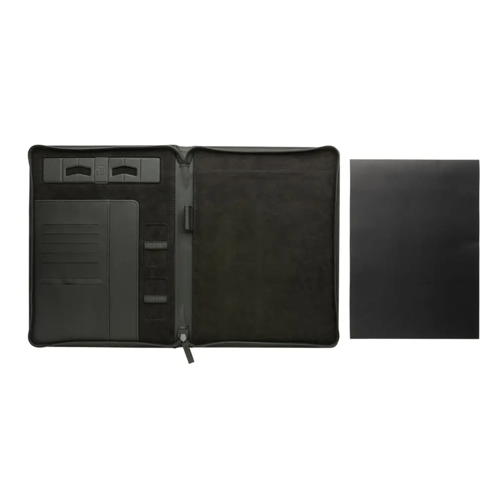 De iconische Italiaanse gerecyclede PU-hoes met ritssluiting beschermt uw documenten optimaal. Binnenin vindt u een tablet- en telefoonstandaard, gadgethouders, vakjes voor visitekaartjes, hoezen voor notities en papieren, plus een pennenlus. Het bevat een notitieblok met 20 vel gelinieerd A4 steenpapier van 144 g/m². Deze indeling maakt het portfolio multifunctioneel, perfect voor marketingprofessionals en event organizers die het uitdelen aan relaties.