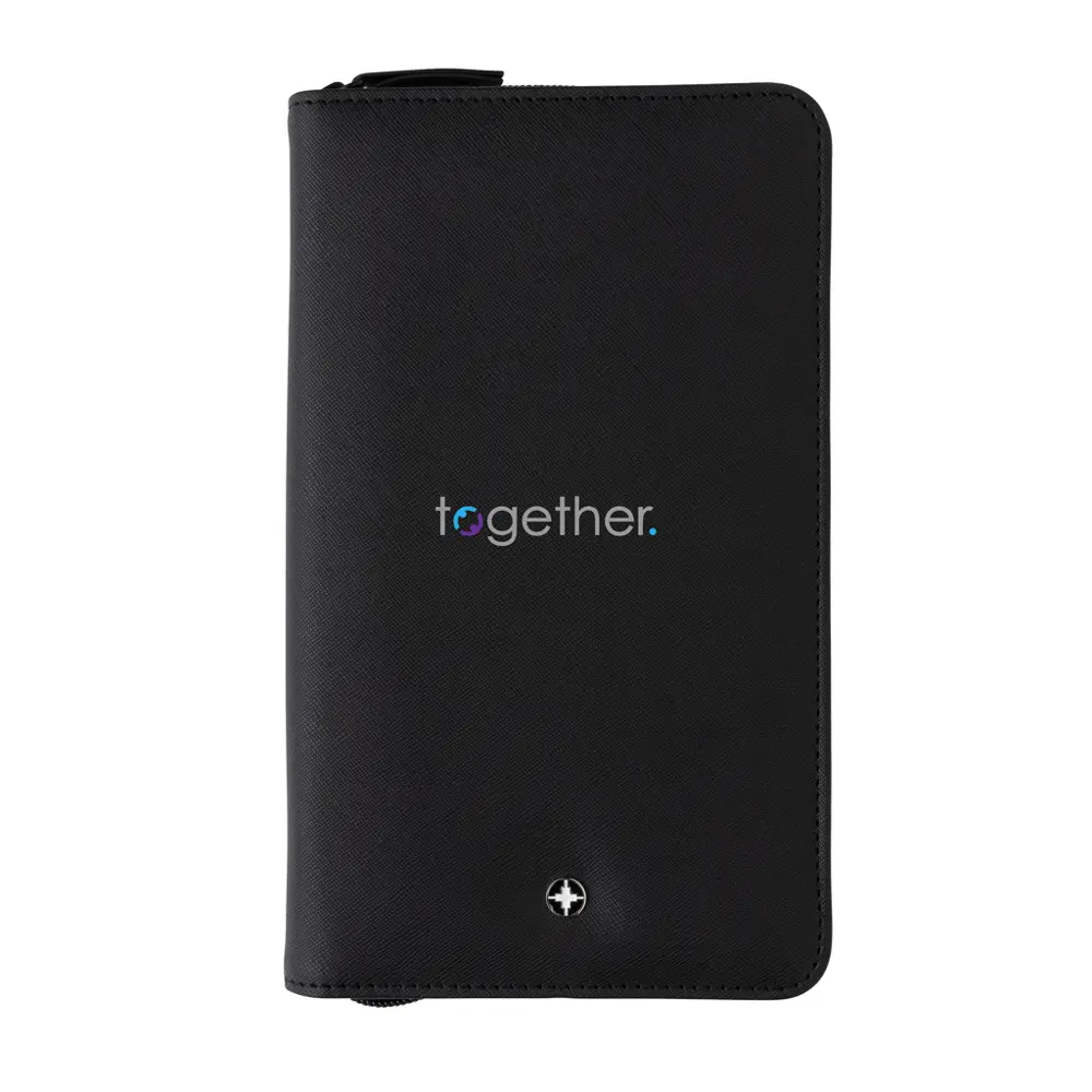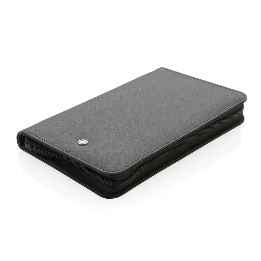 Ontdek deze hoogwaardige reisportemonnee, perfect ontworpen om uw reisdocumenten veilig te bewaren. De portemonnee biedt ruimte voor paspoort, tickets en contant geld, met vier vakjes voor pasjes, een pennenlus en een compartiment voor uw mobiele telefoon. Gemaakt van RCS-gecertificeerd gerecycled PU-materiaal, voldoet het product aan strenge normen voor duurzaamheid en veiligheid.