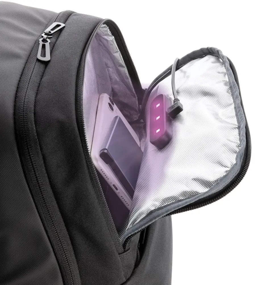 Ontdek de unieke voordelen van deze laptoprugzak met geïntegreerd UV-C steriliserend vak. Het minimalistisch ontwerp combineert functionaliteit en hygiëne, ideaal voor uw dagelijkse reizen of events. De UV-C technologie verwijdert tot 99,9% van de bacteriën op voorwerpen zoals sleutels en telefoon in slechts 3 minuten, zonder giftige stoffen of kwik. Dit zorgt voor een veilige en schone manier om essentiële items te ontsmetten onderweg, wat bijdraagt aan de gezondheid van uw team en relaties.