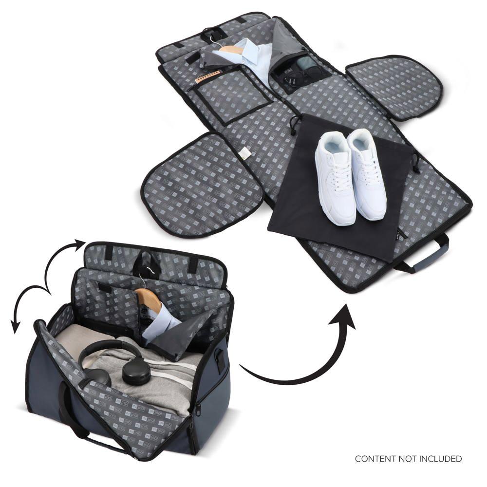 Dankzij de ingebouwde kledingtas neem je een blazer of jurk kreukvrij mee – perfect om professioneel voor de dag te komen bij meetings of netwerkmomenten. De ruime opbergruimte, verstelbare schouderriem en losse schoenenzak houden alles netjes gescheiden, zodat je georganiseerd blijft onderweg.