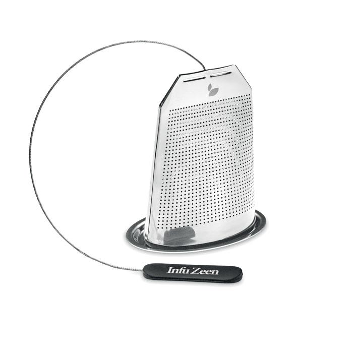 Roestvrijstalen thee-ei in de vorm van een theezakje met schotel. Groot theezeefje met siliconen handvat.