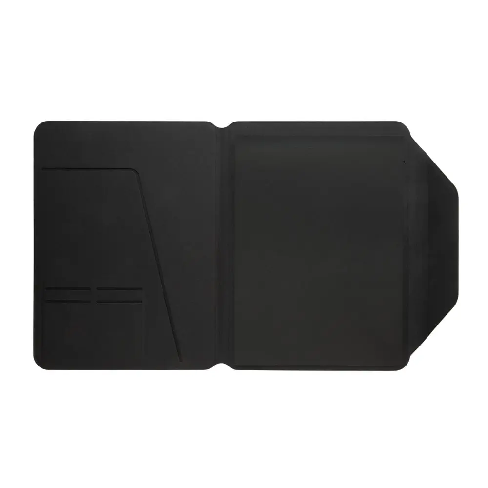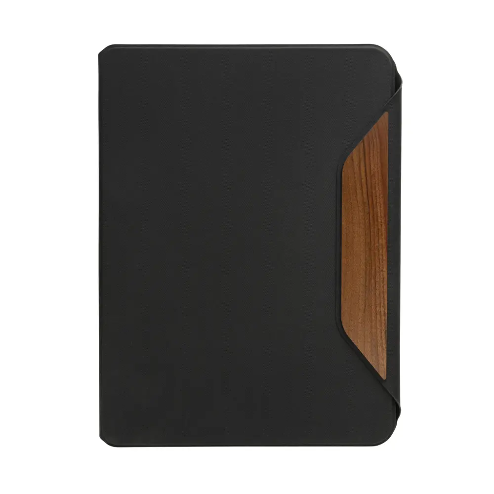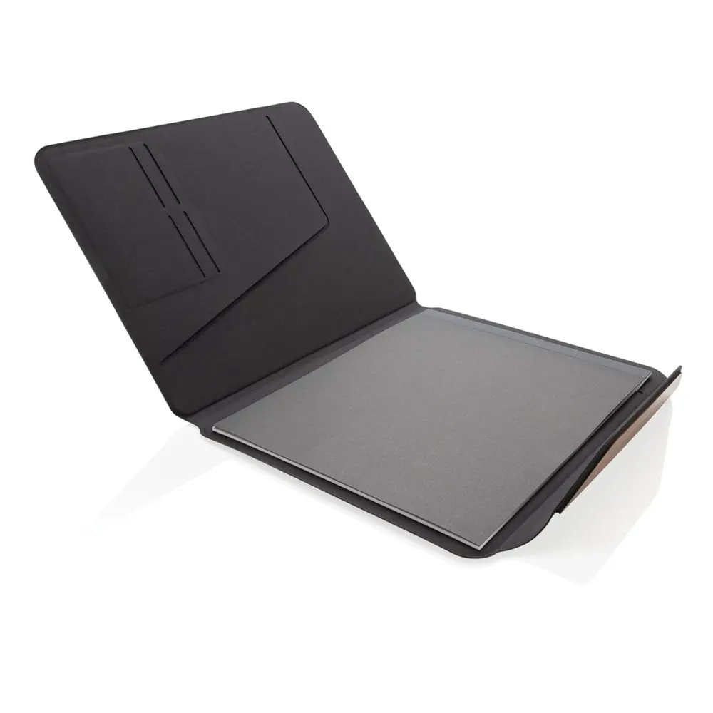 Ontdek de verfijnde Teri AWARE™ RPET en walnoot A4-portfolio, die elegantie en praktisch nut verenigt. Dit portfolio is vervaardigd uit gerecycled polyester met de AWARE™-tracer, gecombineerd met een houten walnoot embleem voor een professionele uitstraling. De magnetische sluiting beschermt uw documenten en accessoires optimaal, terwijl de binnenzijde vier slots voor visitekaartjes en een sleeve voor A4-documenten biedt. Het meegeleverde notitieblok met 30 gelinieerde pagina's van 70 gsm FSC® mix papier zorgt voor efficiënte notities tijdens vergaderingen of events.