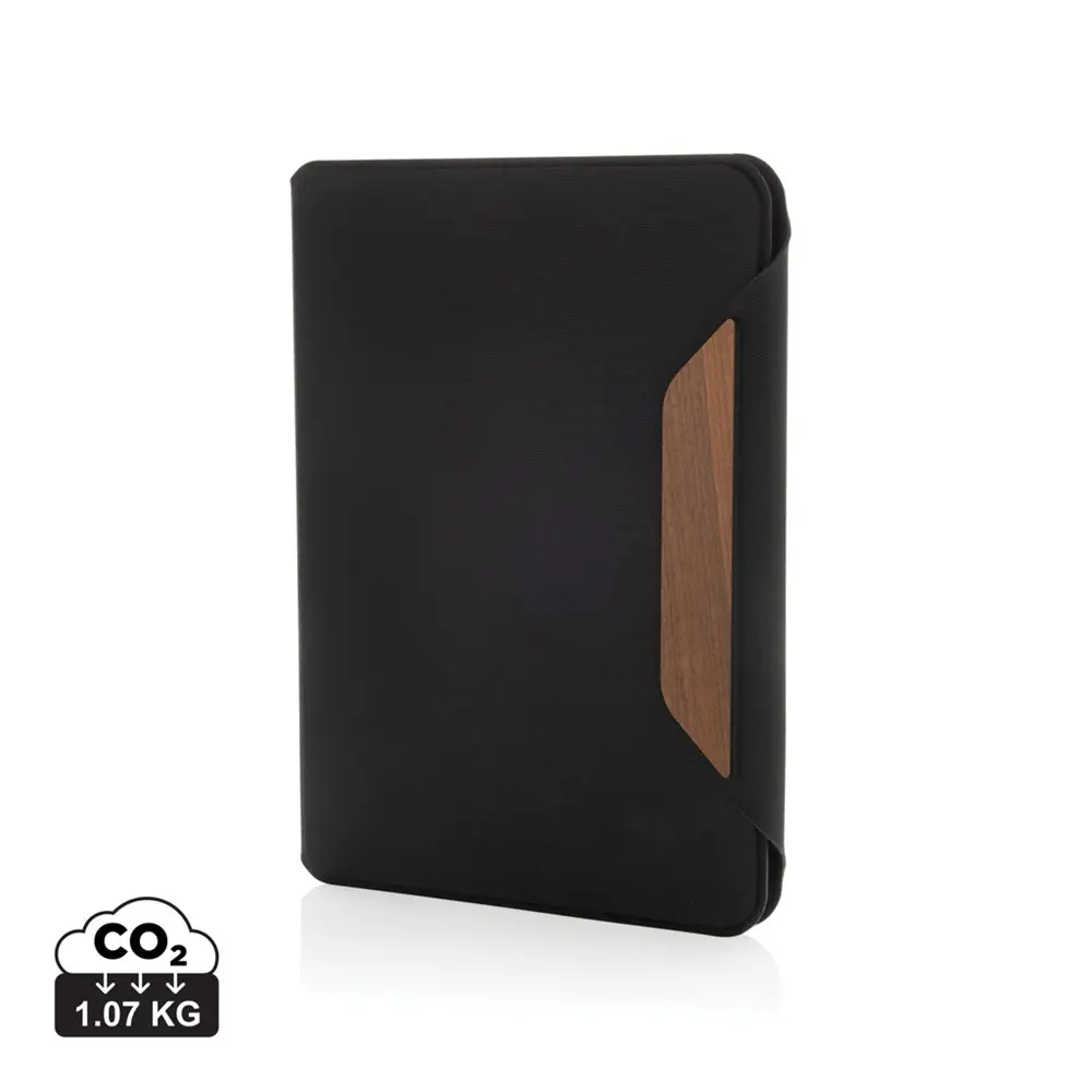 Ontdek de ideale oplossing voor uw zakelijke behoeften met deze stijlvolle A5-portfolio. Gemaakt van hoogwaardig gerecycled polyester (rPET) en afgewerkt met een elegant walnoten embleem, combineert dit product functionaliteit met een professionele uitstraling. De magnetische sluiting zorgt voor veilige bewaring van uw documenten en accessoires, terwijl de binnenzijde biedt wat u nodig heeft voor efficiënt werken.