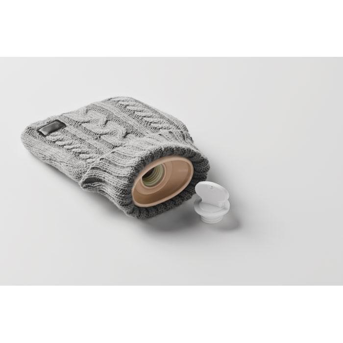 Warmwaterkruik met gebreid acryl zakje. Wordt gebruikt om warmte te geven, meestal in bed, maar ook om warmte toe te dienen op een specifiek deel van het lichaam. Inhoud: 450ml.