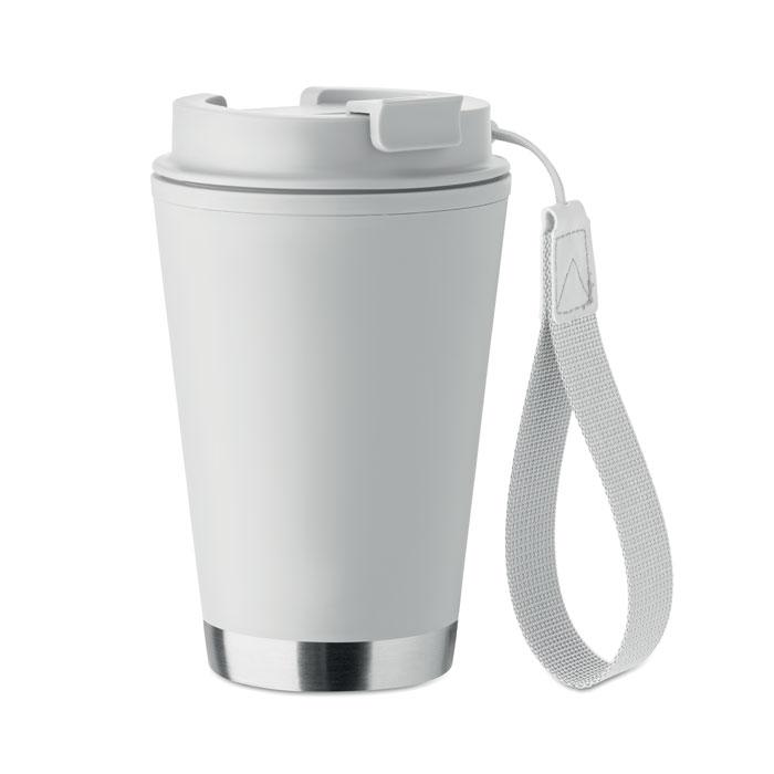 Dubbelwandige beker met PP binnenwand, gerecycled PP buitenwand, gerecycled roestvrijstalen detail en RPET polsband. Inhoud: 300ml.