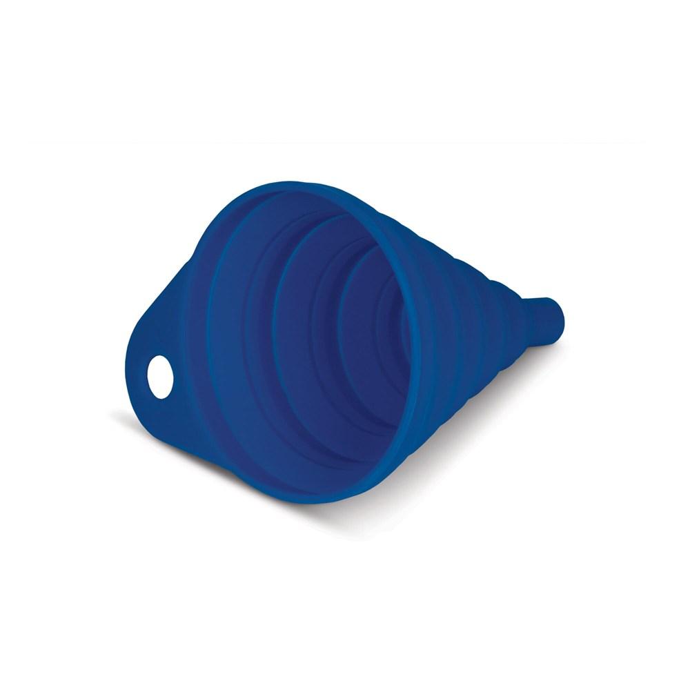 Uitvouwbare trechter voor bijvoorbeeld het bijvullen van de ruitenwisservloeistof in de auto. Kunststof houder met opvouwbare siliconen trechter. Bedrukking op de houder.