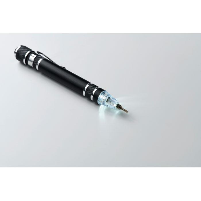 Gerecycled aluminium multitool in penvorm met zaklamp. Inclusief 3 sleuf- en 3 kruiskopschroevendraaiers. inclusief 4 knoopcel LR41 batterijen.