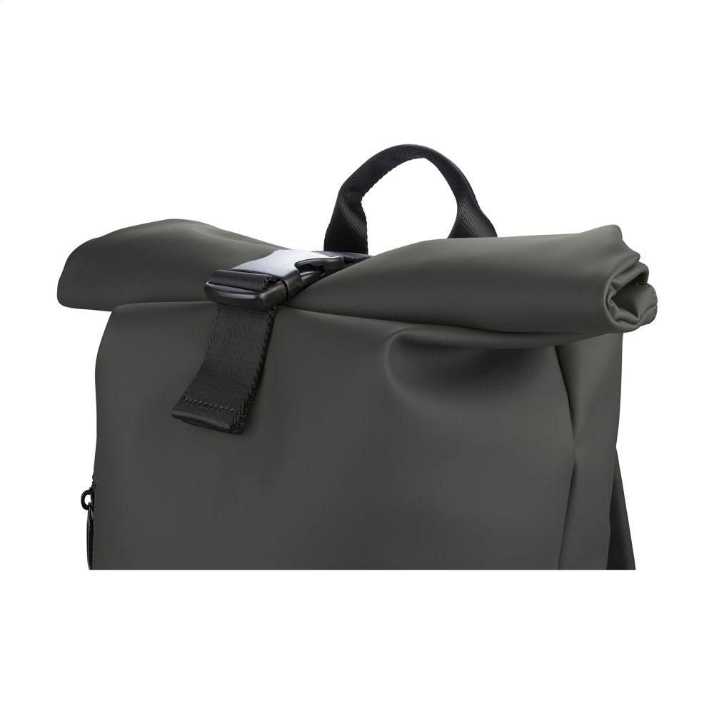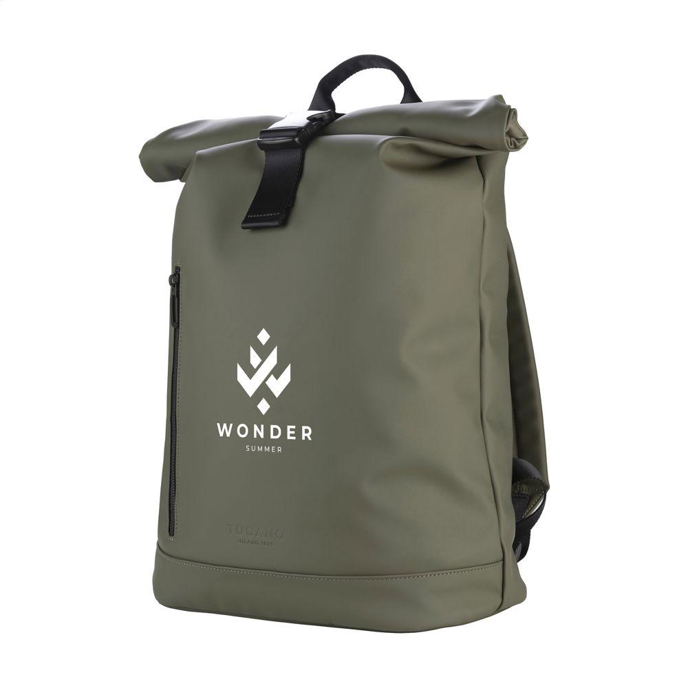 Ontdek deze stijlvolle roll-top rugzak van het Italiaanse merk Tucano, perfect als gepersonaliseerd relatiegeschenk voor jouw events of marketingacties. Gemaakt van soepel, rubberachtig materiaal uit gerecycled kunststof – inclusief 22 PET-flessen – voelt hij verrassend zacht aan en biedt hij volledige waterbestendigheid. Zo blijft alles droog, zelfs bij een plotse bui.