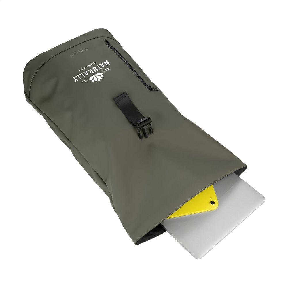Ontdek de Tucano Gommo Rolltop Backpack 15,6 inch handbagage, een sportieve roll-top rugzak van het Italiaanse merk Tucano, perfect als gepersonaliseerd relatiegeschenk met jouw logo. Gemaakt van soepel, waterbestendig rubberachtig materiaal uit gerecycled kunststof – inclusief 22 PET-flessen – geef je jouw merk een duurzame en moderne uitstraling die je klanten aanspreekt.
