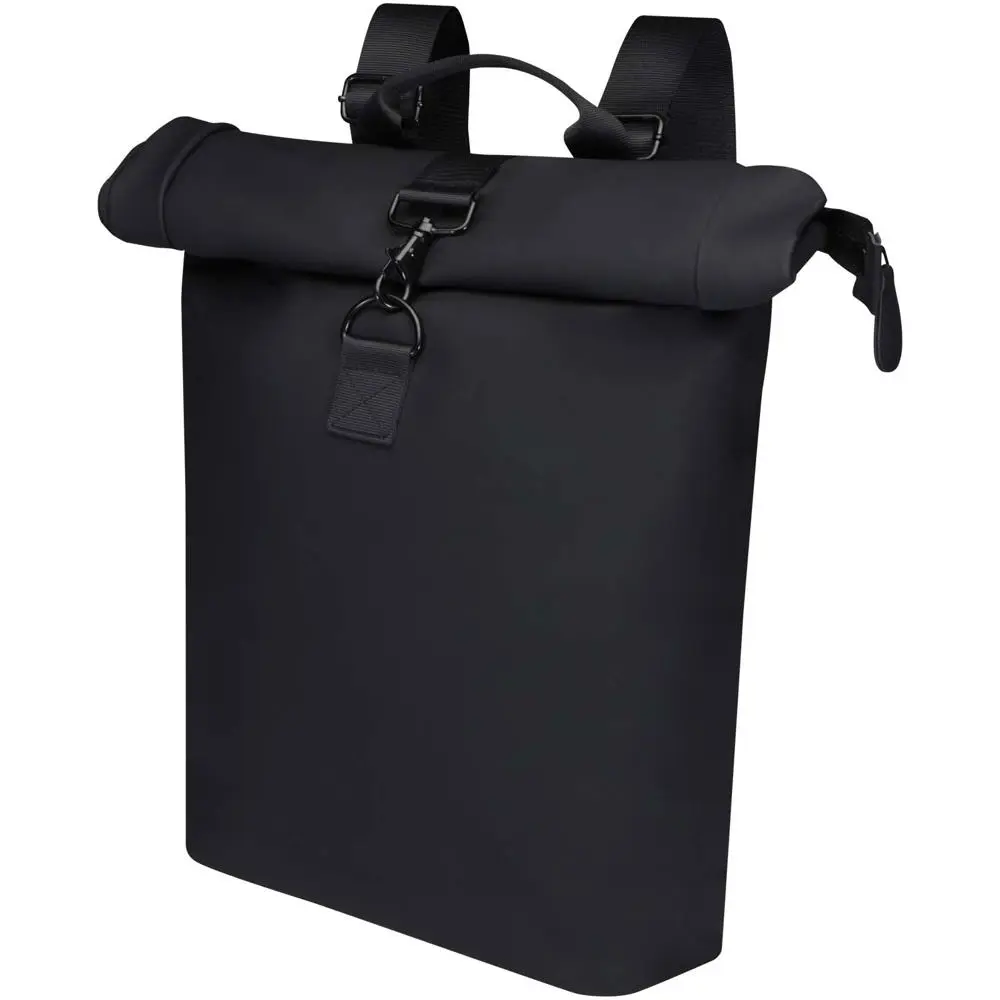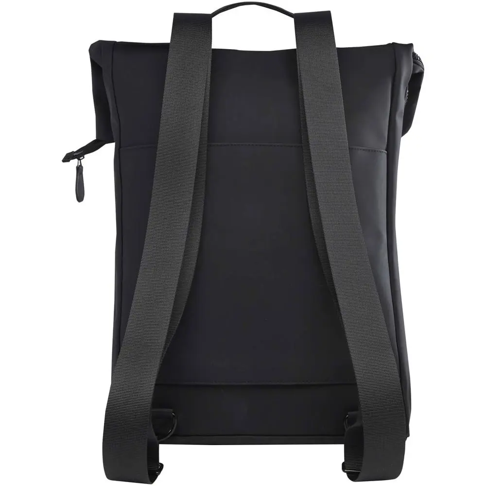 Ontdek de Turner rolltop laptop rugzak, ideaal als gepersonaliseerd relatiegeschenk voor uw marketingacties of events. Gemaakt van 51% GRS-gecertificeerd gerecycled PU en 49% PU, met een voering van 100% GRS-gecertificeerd RPET, combineert deze rugzak duurzaamheid met functionaliteit. Bescherm uw laptop (tot 15,6 inch) en tablet in gewatteerde compartimenten, terwijl een binnenband voor uw waterfles en een ritsvak voor kleine accessoires praktisch opbergen bieden.