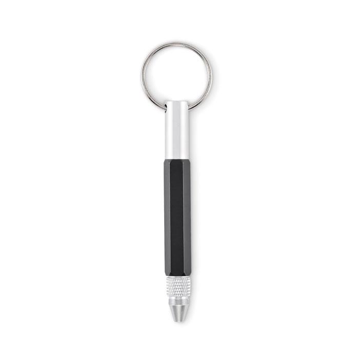 Sleutelhanger met draaipen van gerecycled aluminium, inclusief een liniaal van 4 cm en 1,5 inch, een stylus en een 2-in-1 kruiskop- en platkopschroevendraaier. Zwarte inkt.