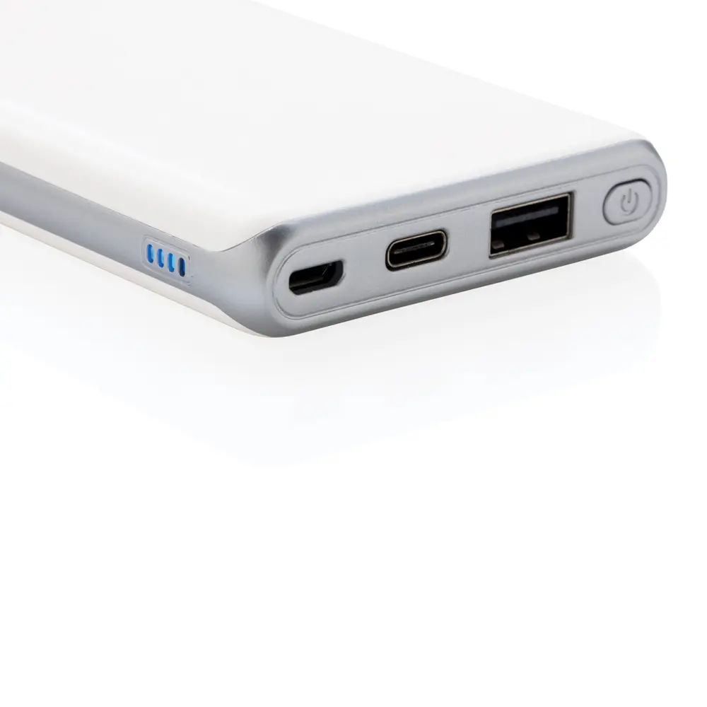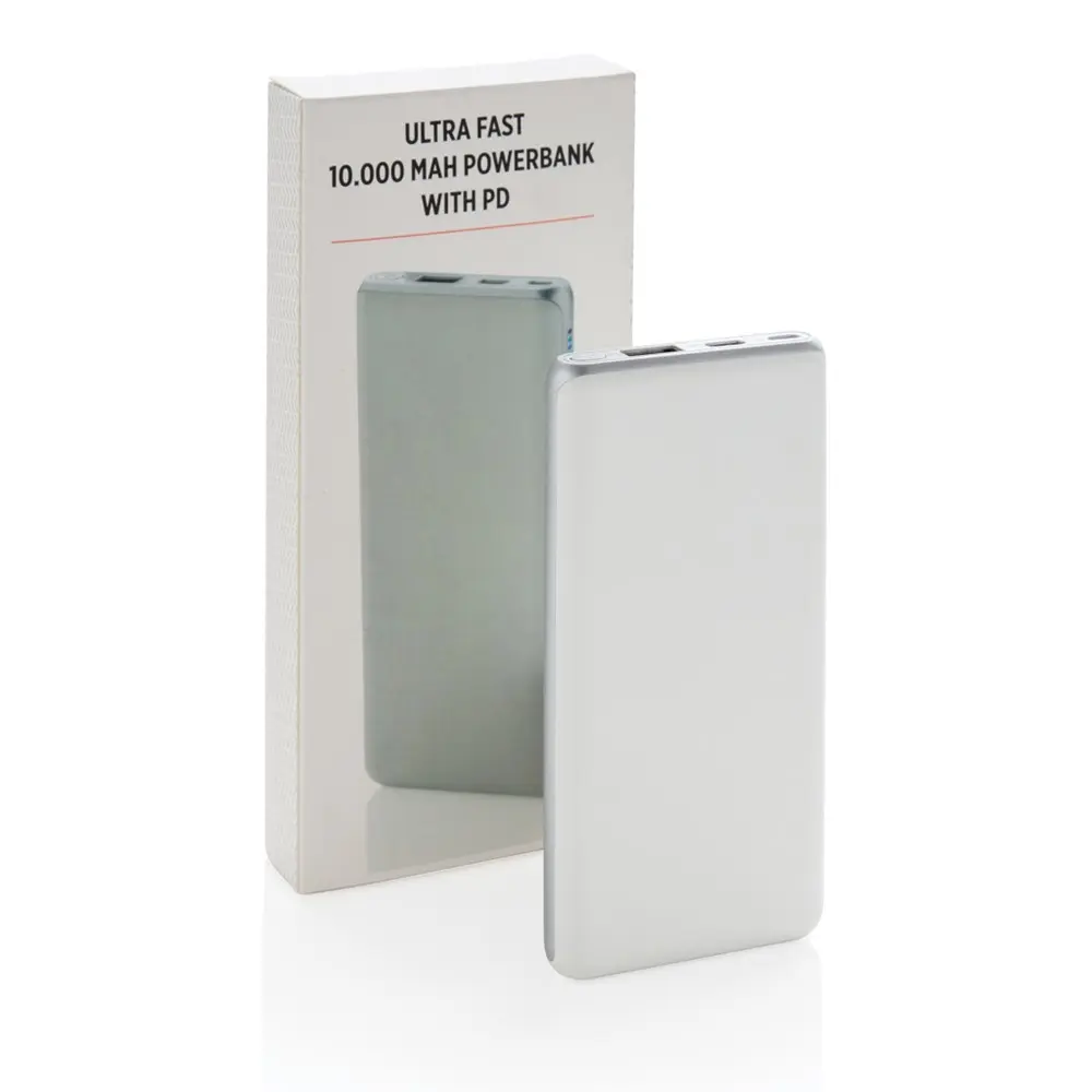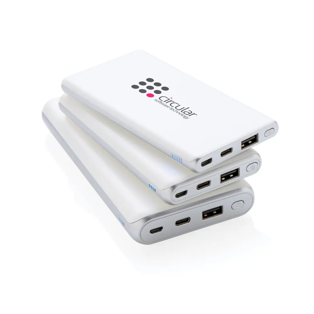 Ontdek onze ultra snelle 10.000 mAh powerbank met PD-technologie, ideaal voor uw marketingacties en events. Deze hypermoderne powerbank, vervaardigd uit robuust ABS-materiaal, biedt razendsnelle oplading voor uw iPhone, MacBook en andere apparaten via de Type C-poort (tot 18W). Met een micro-USB-ingang (5V/2A) en veelzijdige USB- en Type C-outputs (tot 5V/3A, 9V/2A, 12V/1.5A) houdt u meerdere toestellen draaiende zonder onderbreking.