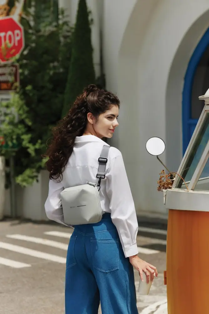 De tas heeft voldoende ruimte voor een 8-inch tablet, portemonnee, paspoort en kleine accessoires. De achterzak zorgt voor discreet opbergen van waardevolle spullen. Gemaakt van duurzame rPET-stof met zachte PU-coating, is ze waterafstotend en robuust, ideaal voor dagelijks gebruik.