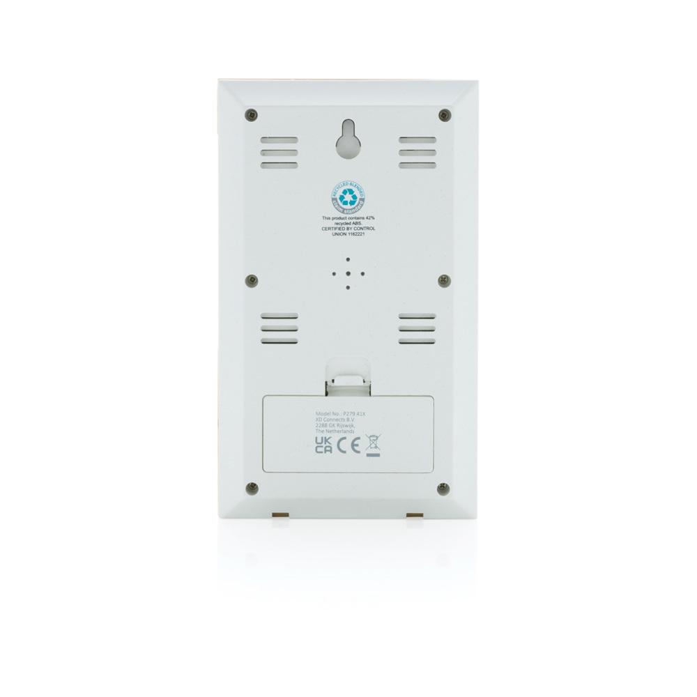 Weerstation gemaakt met RCS (Recycled Claim Standard) gecertificeerd gerecycled ABS en FSC® 100% bamboe. Totaal gerecycled materiaal: 42 % op basis van het totale gewicht van het artikel. RCS-certificering zorgt voor een volledig gecertificeerde toeleveringsketen van de gerecyclede materialen. Met LCD-scherm. Functies: temperatuur, vochtigheid, tijd, weekdag, datum, temperatuur. Inclusief aaa batterijen voor direct gebruik. Verpakt in FSC® mix kraft doos.