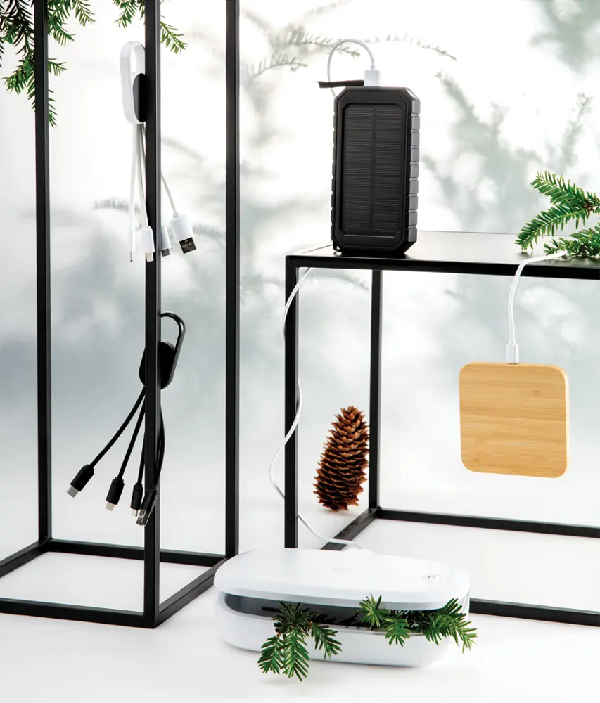 Ontdek onze multifunctionele uv-c sterilisator, ideaal als gepersonaliseerd relatiegeschenk voor uw onderneming. Met deze innovatieve box elimineert u tot 99,9% van de bacteriën op alledaagse voorwerpen, zodat u en uw relaties altijd hygiënisch beschermd zijn. Plaats eenvoudig uw mobiele telefoon, oordopjes, sieraden, horloges of gezichtsmaskers in het apparaat voor een snelle en effectieve sterilisatie via geavanceerde uv-c-technologie.