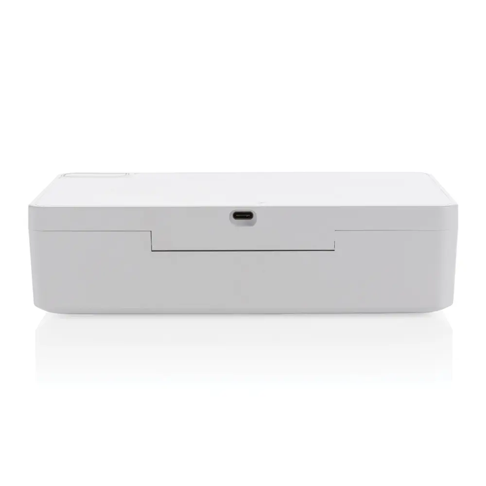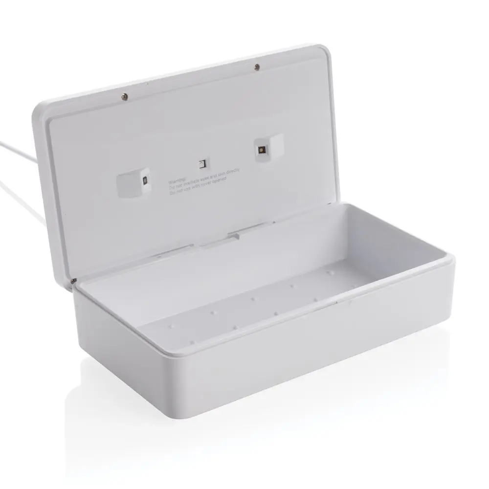 Ontdek onze multifunctionele uv-c sterilisator, ontworpen om uw hygiëne op een eenvoudige en effectieve manier te verbeteren. Deze sterilisator elimineert tot 99,9% van de bacteriën op alledaagse voorwerpen, zoals mobiele telefoons, oordopjes, sieraden, horloges en gezichtsmaskers. Met uv-c-technologie biedt het een veilige oplossing voor uw team en klanten, ideaal als gepersonaliseerd relatiegeschenk met logobedrukking.