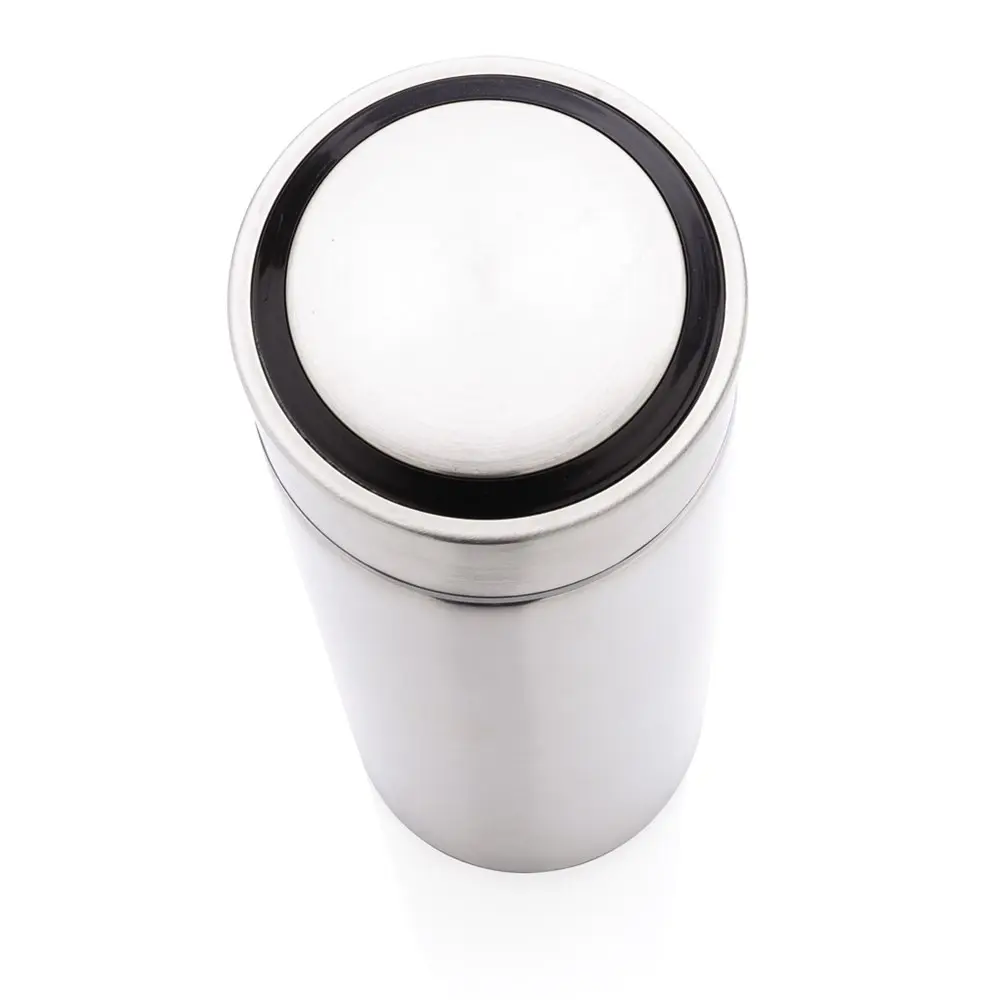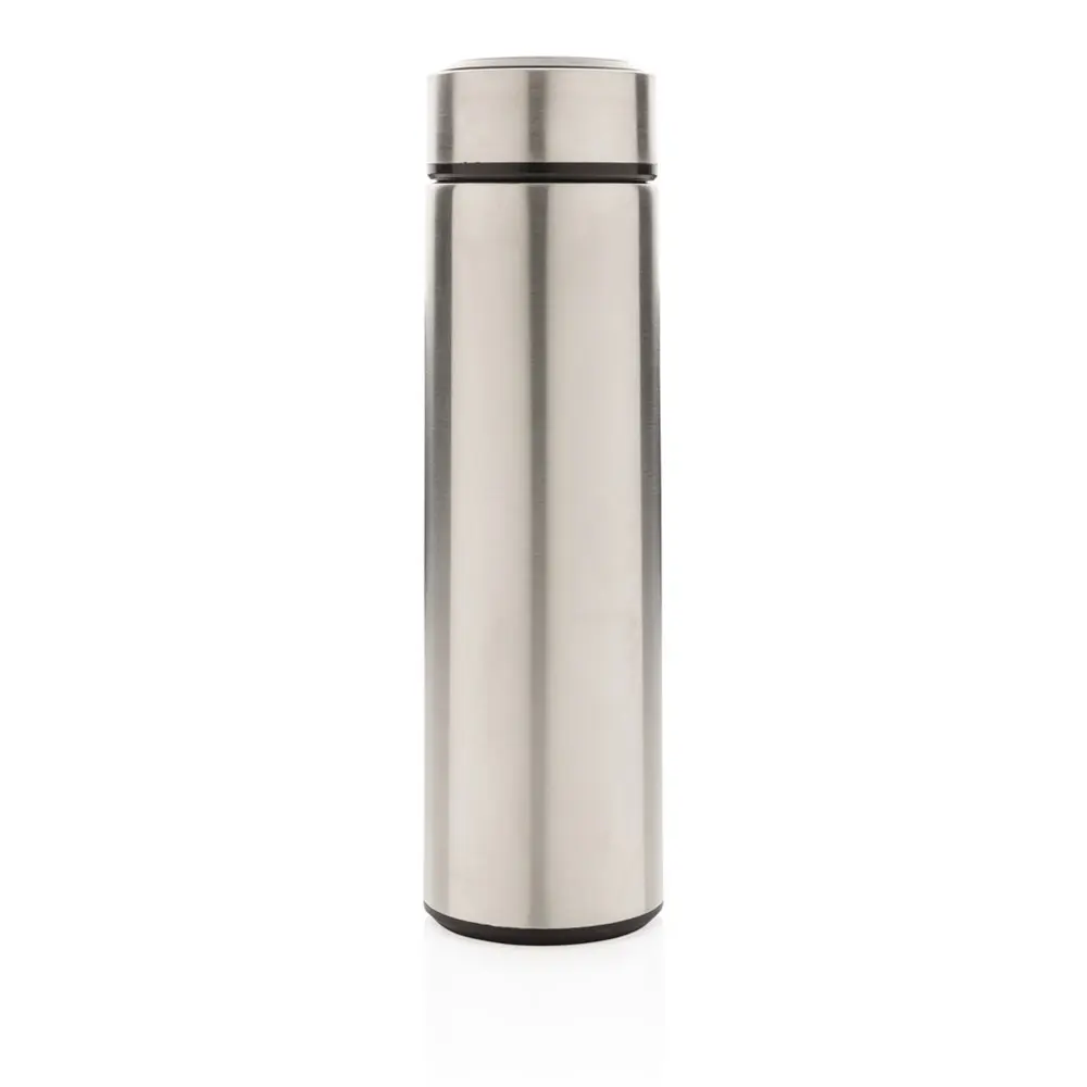 Ontdek onze vacuüm roestvrijstalen fles met geborsteld metalen dop, ideaal als gepersonaliseerd relatiegeschenk voor uw bedrijf. Deze fles houdt uw drankjes tot 5 uur warm en 15 uur koud, dankzij de hoogwaardige vacuümisolatie. Met een capaciteit van 450 ml en een lekvrije schroefdop biedt hij praktisch gebruik onderweg, terwijl de brede opening eenvoudige reiniging mogelijk maakt. Gemaakt van veilig RVS en PP-materiaal, BPA-vrij en conform voedselveiligheidsnormen.