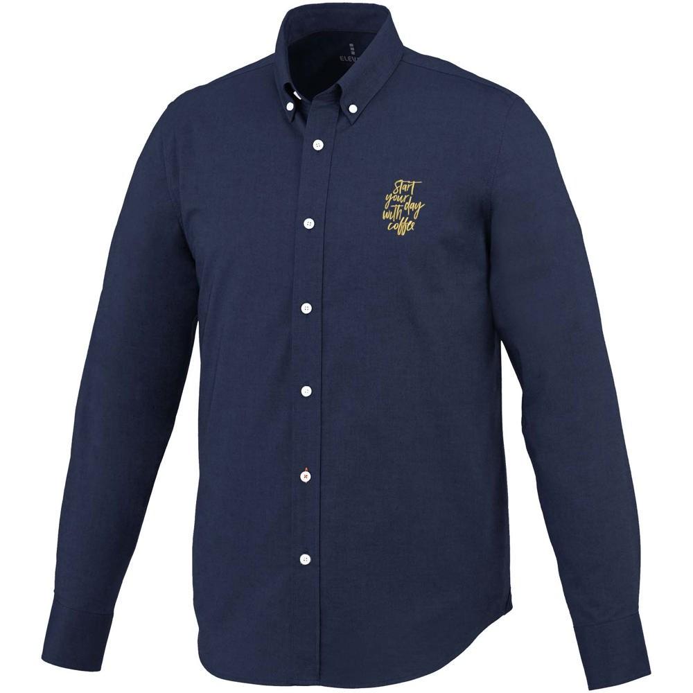 Je personaliseert dit overhemd eenvoudig met je logo via onze bedrukkingsservice, ideaal voor grote bestellingen als relatiegeschenk. De button-down kraag en het subtiele stiksel bij het onderste knoopsgat geven het een stijlvolle touch die moeiteloos schakelt tussen formele events en casual promoties.