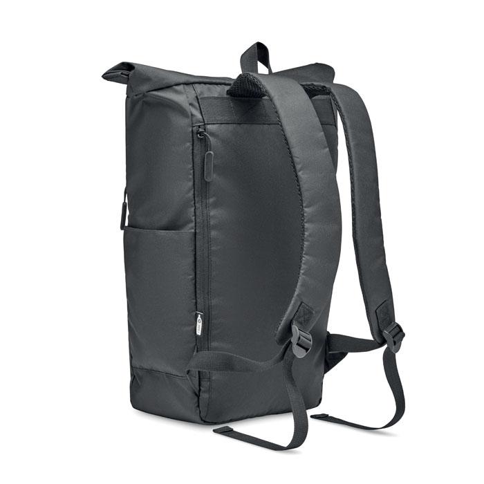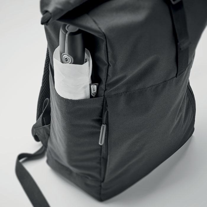 Ontdek deze stijlvolle 15 inch rolltop laptop rugzak, vervaardigd uit robuust 300D RPET-polyester. Dankzij het gerecyclede materiaal draag je bij aan een duurzamere wereld, terwijl je bedrijf een groen imago uitstraalt bij je klanten.