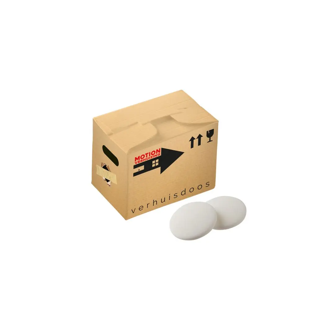 Ontdek ons verhuisdoosje met pepermunt, een origineel gepersonaliseerd relatiegeschenk van papier met full colour logobedrukking. Dit compacte doosje, ontworpen als een charmant verhuisdoosje en gevuld met frisse pepermuntjes, is perfect voor uw marketingacties of events. Het trekt onmiddellijk de aandacht van uw klanten en versterkt uw merkherkenning door de opvallende personalisatie.