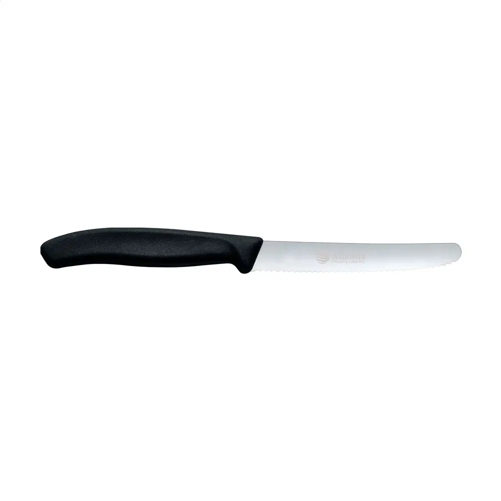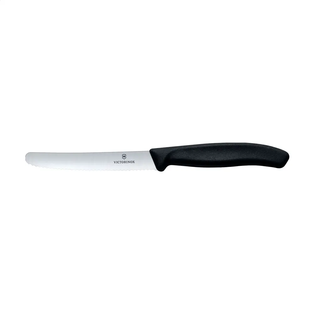 Ontdek het Victorinox Swiss Classic tafelmes, een topkwaliteit relatiegeschenk voor uw marketingacties en events. Dit mes met hoogwaardig RVS lemmet van 11 cm, gekarteld en met ronde punt, biedt precisie en duurzaamheid voor maaltijden of keukenklusjes. Het ergonomische kunststof heft ligt perfect in de hand, terwijl de vaatwasserbestendigheid het onderhoud eenvoudig houdt. Gemaakt in Europa voor langdurig gebruik.