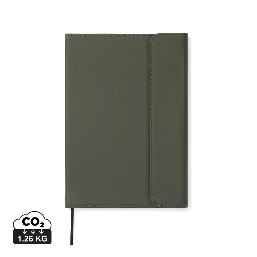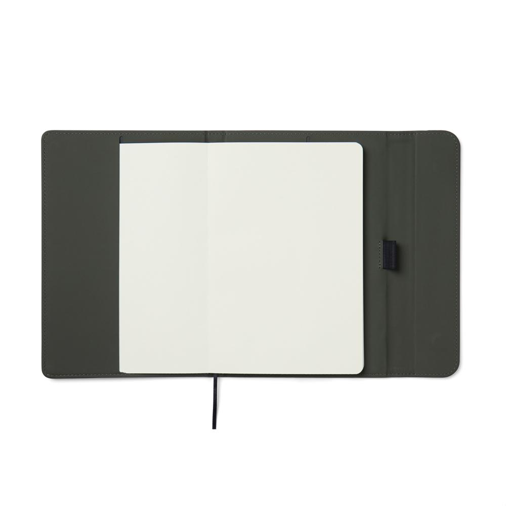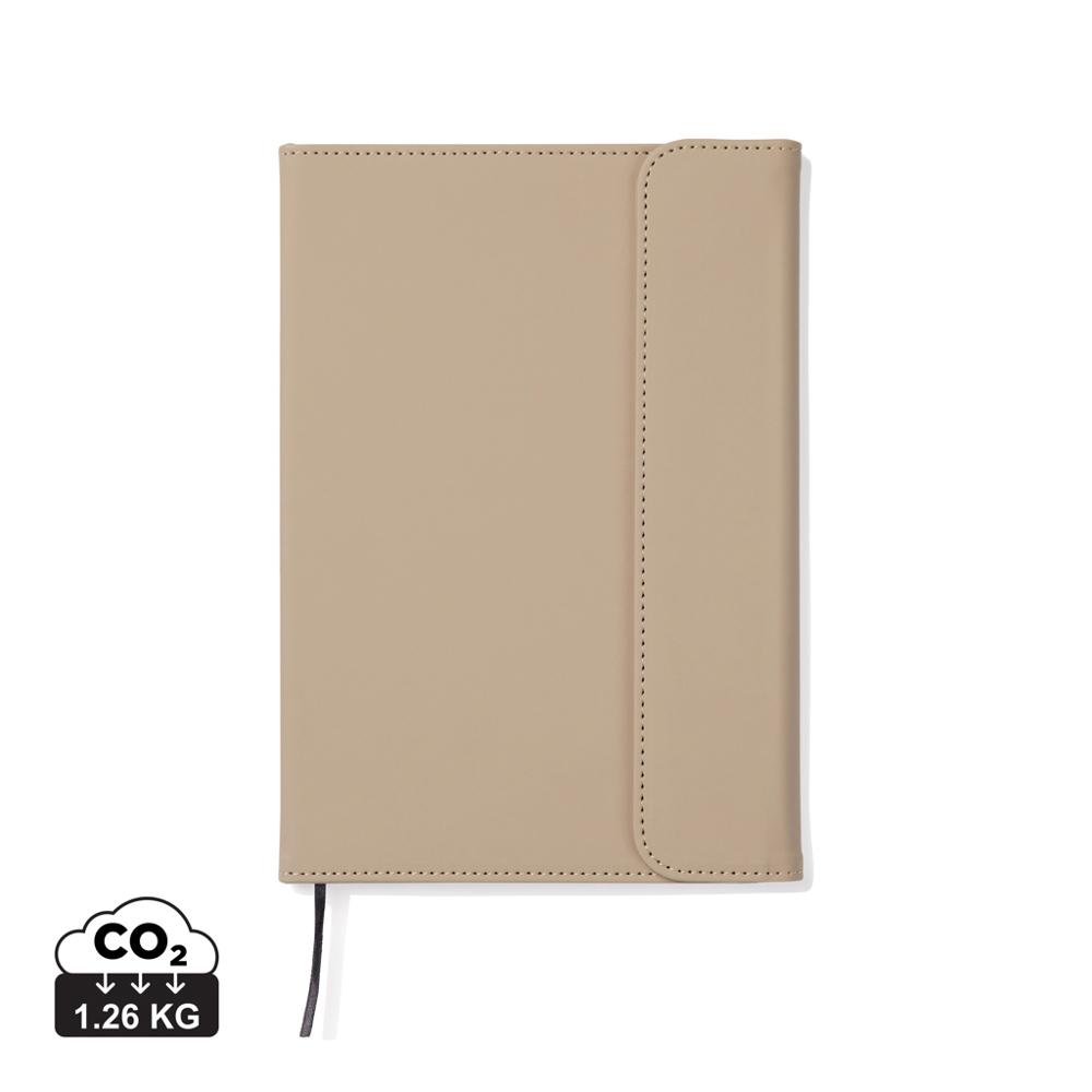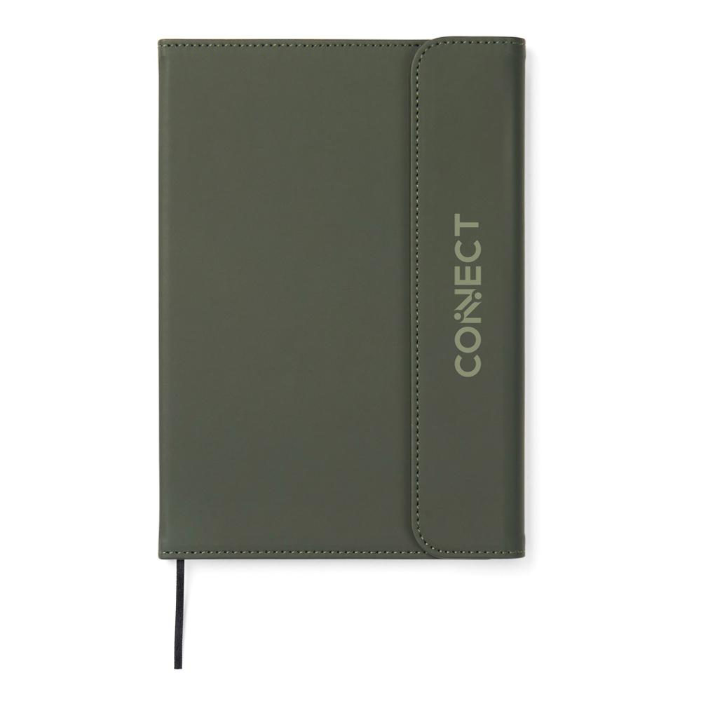 Elegant A5 notitieboek met een moderne uitstraling. De omslag, gemaakt van 30% gerecycled mat PU, heeft een magnetische sluiting en een geïntegreerde penhouder. Gevuld met 80 pagina's/160 vellen 70 grams gelinieerd gerecycled papier, geschikt voor al je notities. Het binnenwerk kan worden vervangen, zodat je de omslag kunt blijven gebruiken. Gecertificeerd door GRS (Global Recycled Standard), deze certificering garandeert dat de hele toeleveringsketen van de gerecyclede materialen gewaarborgd is. Het totale gerecyclede gehalte is gebaseerd op het totale productgewicht. Dit product bevat 54% GRS-gecertificeerd papier en 5% GRS-gerecycled PU.