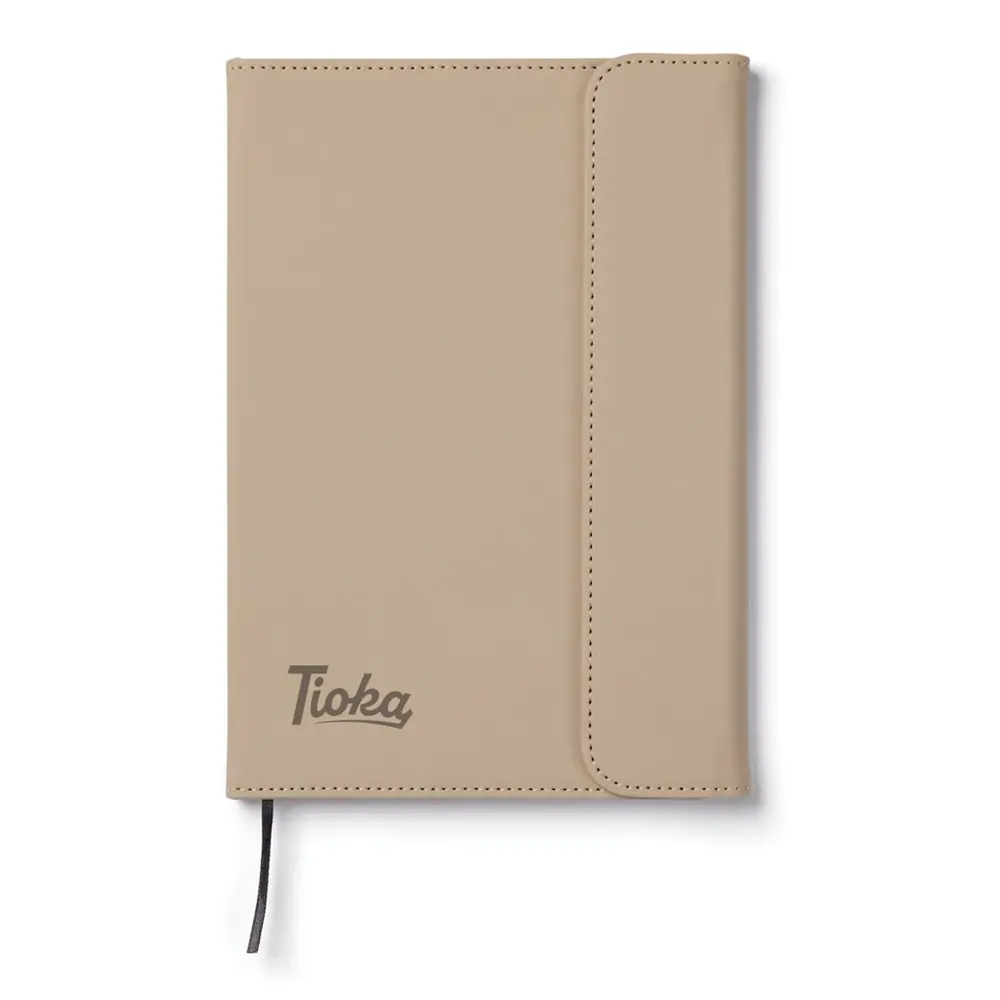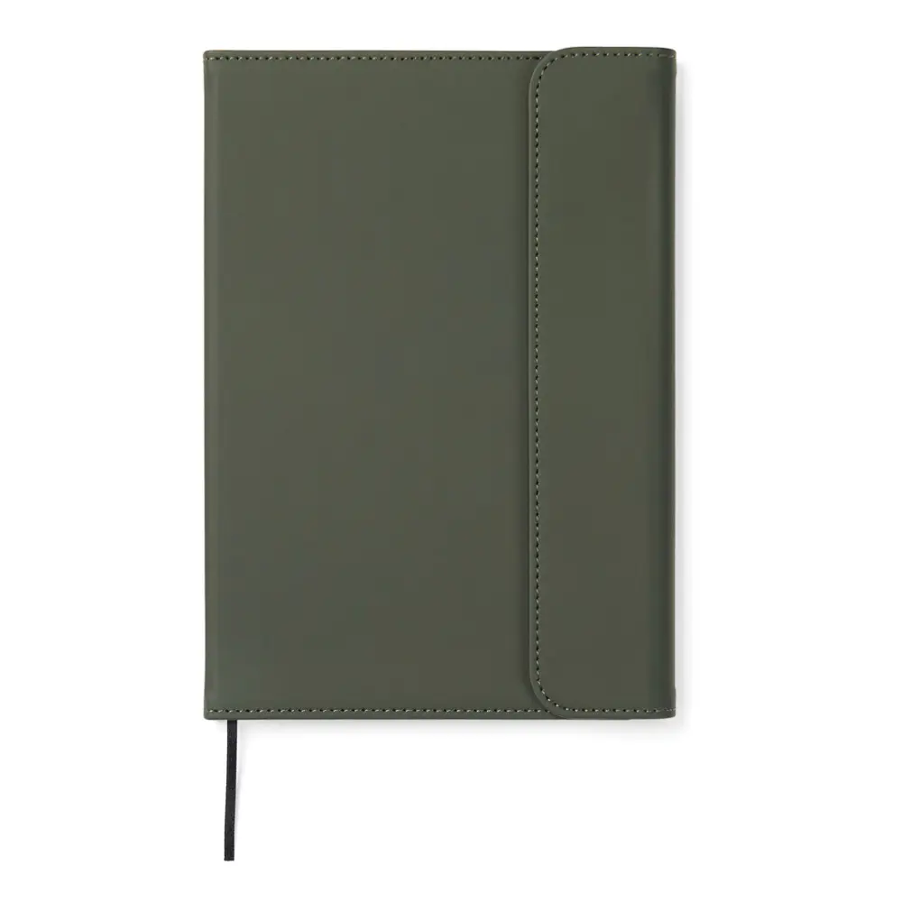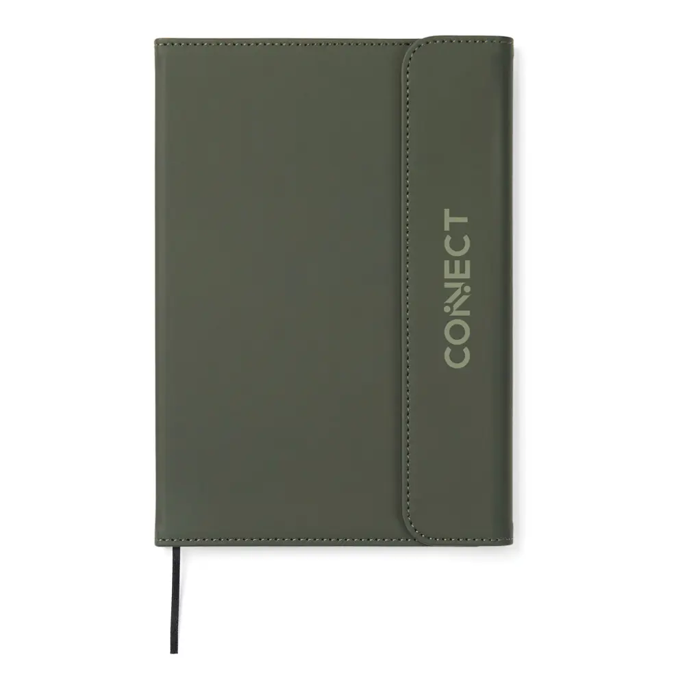 Ontdek ons elegant A5 notitieboek met een moderne uitstraling, ideaal als gepersonaliseerd relatiegeschenk voor uw bedrijf. De omslag bestaat uit 30% gerecycled mat PU-materiaal, voorzien van een praktische magnetische sluiting en geïntegreerde penhouder. Dit notitieboek vult u met 80 pagina's of 160 vellen 70 grams gelinieerd gerecycled papier, perfect voor al uw notities en ideeën.