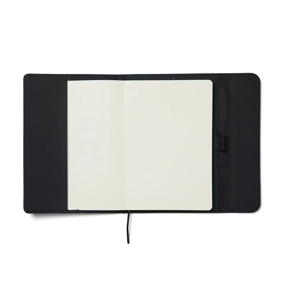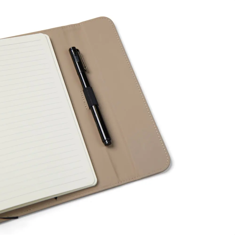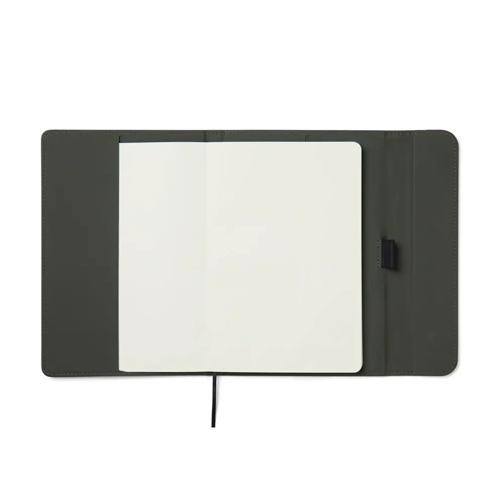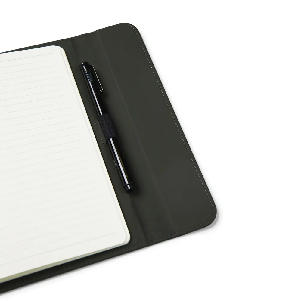 Ontdek ons elegant A5 notitieboek met een moderne uitstraling, ideaal als gepersonaliseerd relatiegeschenk voor uw bedrijf. De omslag bestaat uit 30% gerecycled mat PU-materiaal, voorzien van een praktische magnetische sluiting en geïntegreerde penhouder. Dit notitieboek vult u met 80 pagina's of 160 vellen 70 grams gelinieerd gerecycled papier, perfect voor al uw notities en ideeën.