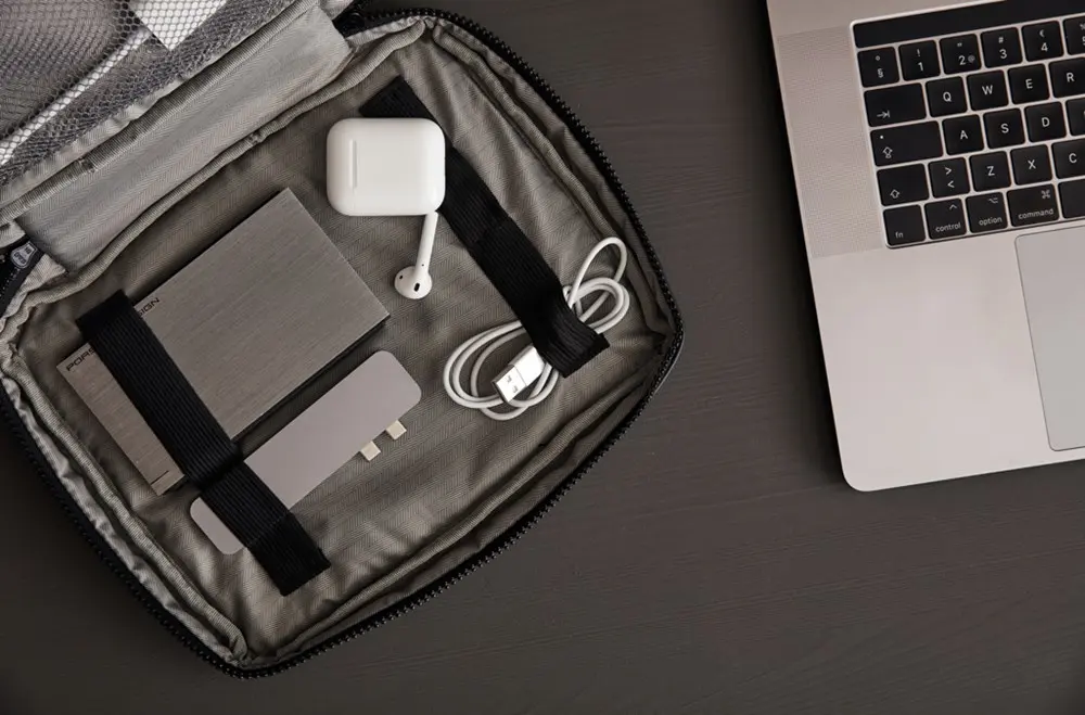 Houd al uw benodigdheden georganiseerd met deze veelzijdige organizer. U vindt er ruimte voor essentiële items zoals een koptelefoon, powerbank, pennen en notitieboekjes, ideaal voor een drukke werkdag of event. De karabijnhaak aan de korte zijde laat u de organizer eenvoudig bevestigen aan een grotere tas, zodat u alles binnen handbereik hebt.