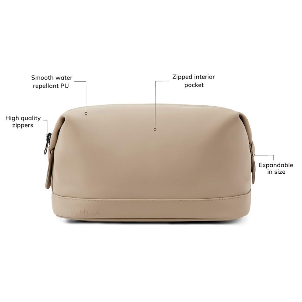 De VINGA Baltimore toilettas is jouw ideale relatiegeschenk met minimalistisch en modern ontwerp. Gemaakt van waterafstotend materiaal met 60% polyurethaan en 40% polyester, beschermt hij de inhoud perfect tegen vocht, en hij sluit stevig met een rits. PVC-vrij en duurzaam, ideaal voor op reis of vakantie.