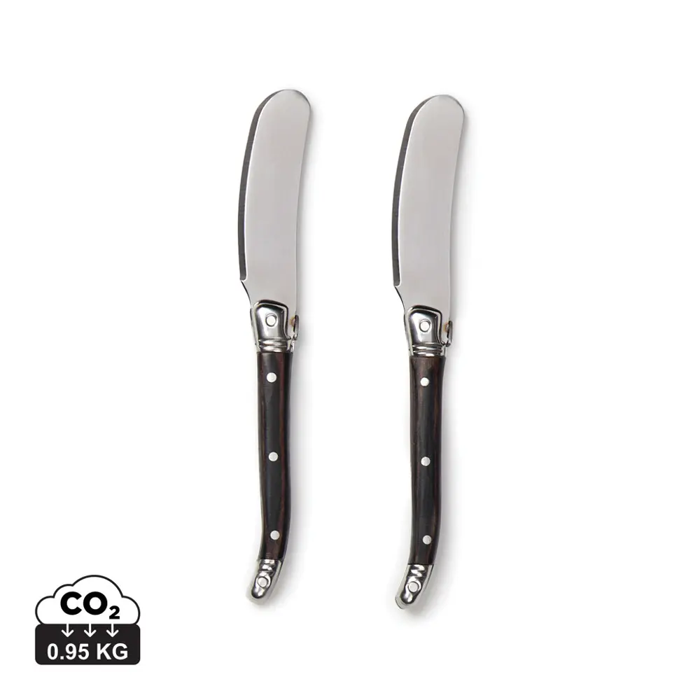 Ontdek de VINGA Gigaro botermessenset, een exclusief 2-delig relatiegeschenk uit roestvrij staal met pakkahouten handgrepen. Deze hoogwaardige messen zorgen voor een soepele en precieze verspreiding van boter, jam of smeerbaar op brood, toast of muffins, ideaal voor dagelijks gebruik. De comfortabele grip biedt optimale controle, terwijl het duurzame materiaal langdurige hygiëne en functionaliteit garandeert, conform strenge voedselveiligheidsnormen.