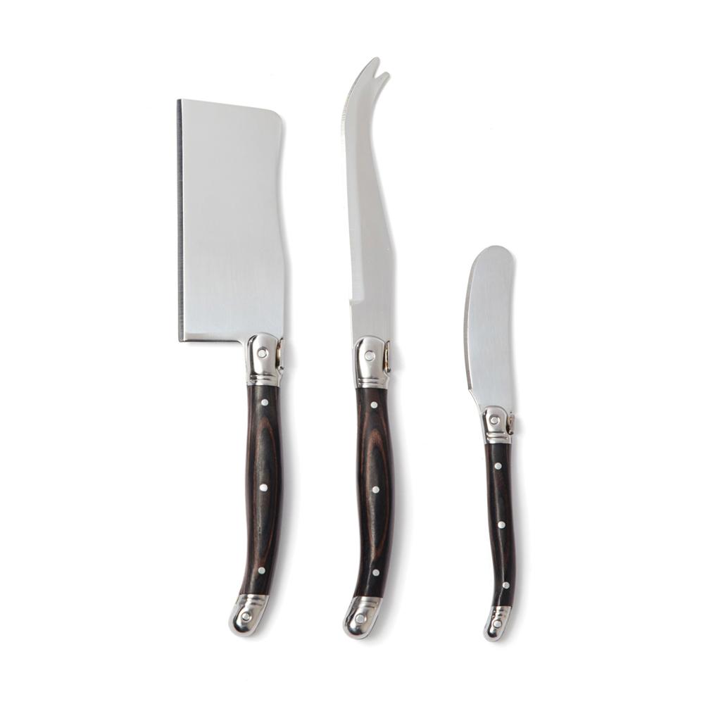 Een exclusieve kaasset bestaande uit twee kaasmessen en een botermes van roestvrijstaal met zwarte handvaten gemaakt van pakkahout. Wordt geleverd in een luxe geschenkverpakking.