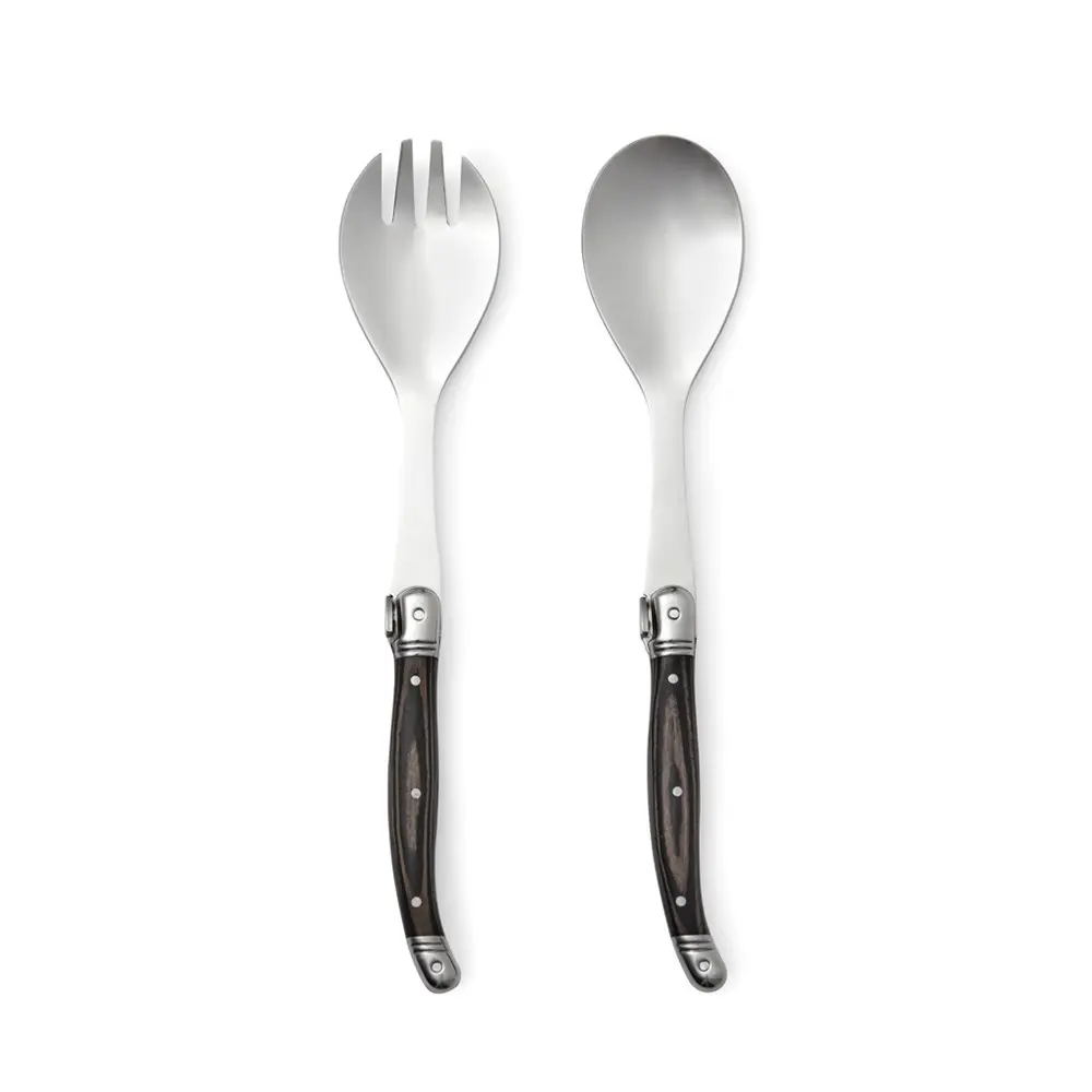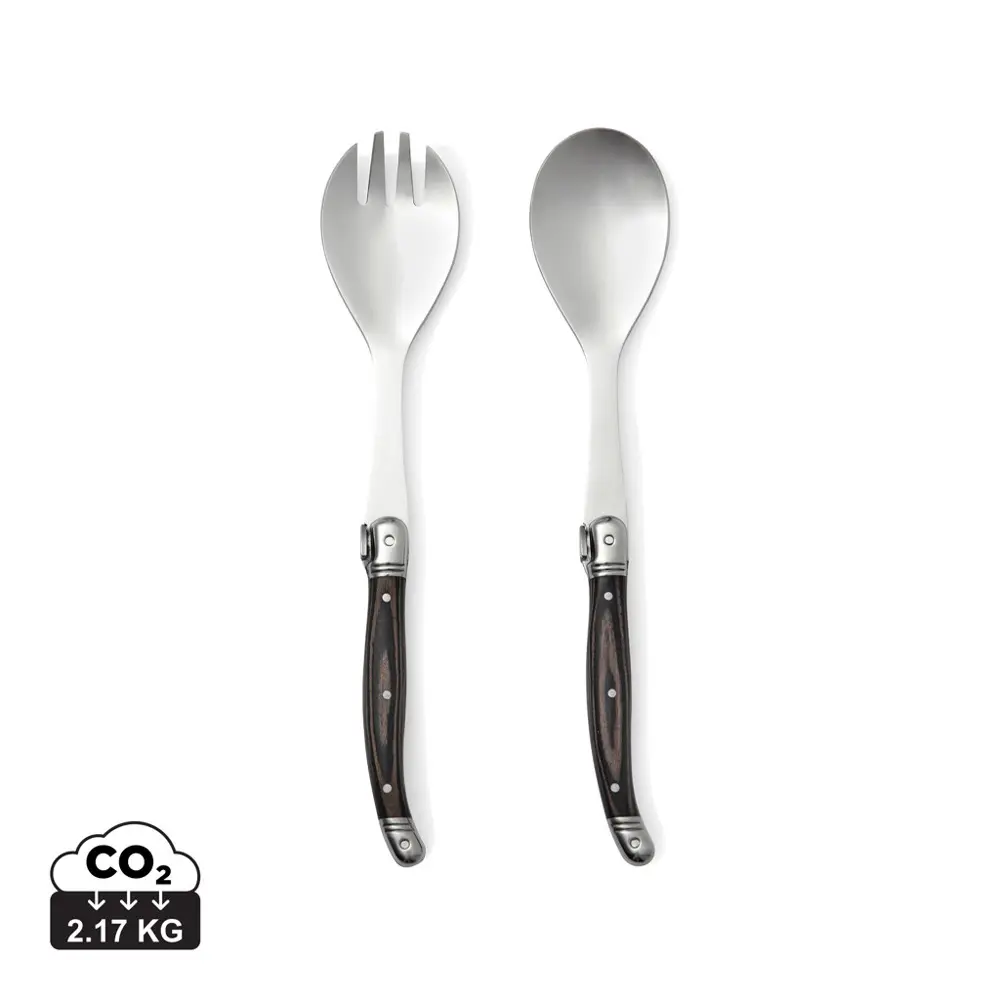 Ontdek ons saladebestek van superieure kwaliteit, geïnspireerd op de klassieke Franse bistrotraditie. Het combineert een robuust roestvrijstalen lemmet met een ergonomisch houten heft voor een optimale grip en elegantie. Dit serveersbestek voldoet aan strenge Europese normen voor voedselveiligheid, waaronder EN14184-1 voor formaldehydegehalte, 1935/2004/EC en 2020/1245 voor voedselcontactmaterialen, en 1999/51/EC voor PCP-gehalte. Verpakt in een luxe geschenkdoos, is het direct klaar voor gebruik als relatiegeschenk.