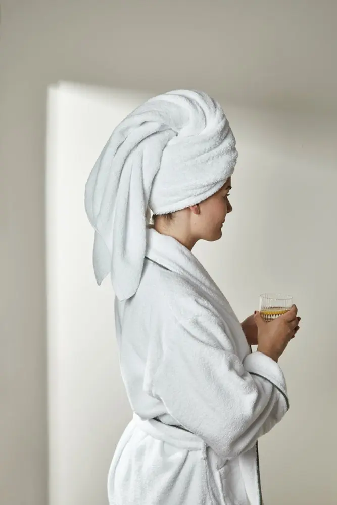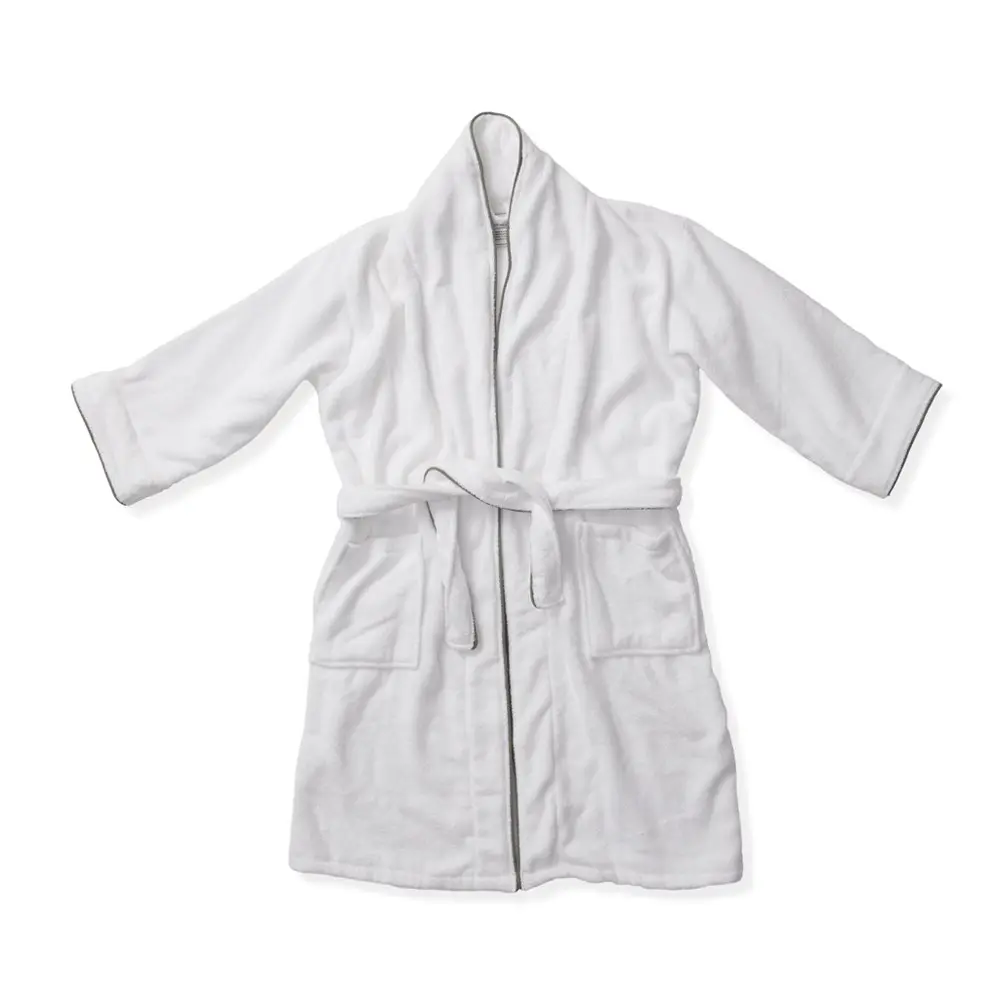 Ontdek onze luxueuze badjas, vervaardigd uit 100% katoen met lange vezels en ongedraaide draden. Dit klassieke model beschikt over een extra brede kraag, een ceintuur in de taille, ingesloten naden en contrasterende biezen op de kraag. Met een materiaalgewicht van 450 g/m² biedt deze badjas een uitzonderlijke zachtheid die u en uw relaties langdurig plezier schenkt.