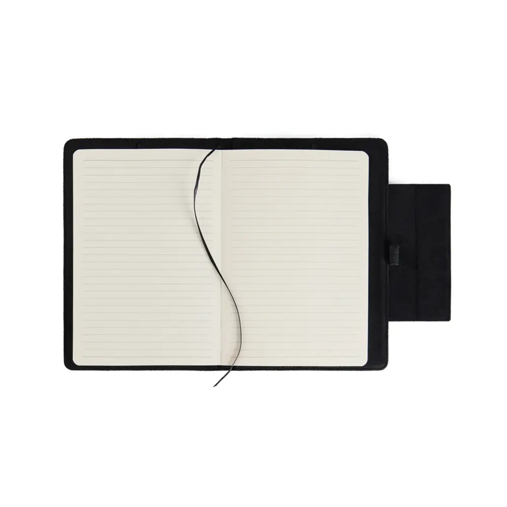 Ontdek ons A5-notitieboek met 160 gelinieerde pagina’s (80 vellen), ideaal om uw notities georganiseerd en in stijl te houden tijdens vergaderingen of events. Dit accessoire combineert tijdloos ontwerp met gerecycleerd kunstleer, PU-details en gerecycled papier, en biedt u een praktische magnetische sluiting voor eenvoudig openen en sluiten. Dankzij de GRS-certificering (Global Recycled Standard) voldoet het aan strenge normen voor de gehele toeleveringsketen van gerecyclede materialen, met een totaal gerecycled gehalte van 56% op basis van het productgewicht. Het bevat 50% GRS-gecertificeerd gerecycled papier en 6% GRS-gecertificeerd gerecycled polyester.