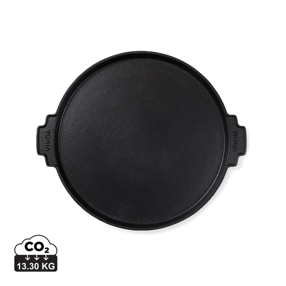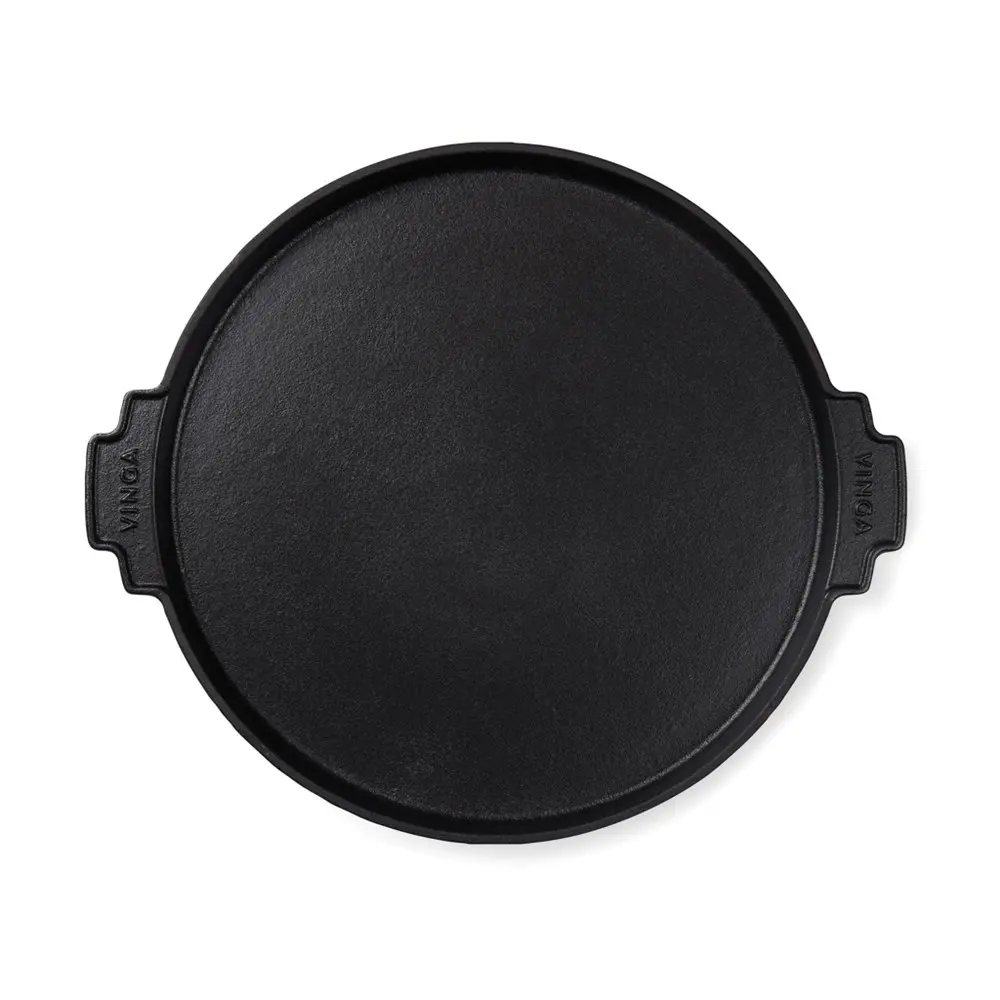 Ontdek de VINGA Monte Ardoise grillplaat van 30 cm diameter, vervaardigd uit robuust mat geëmailleerd gietijzer. Deze veelzijdige plaat is ideaal voor het grillen van groenten of het bakken van pizza's, en compatibel met alle kookplaten, inclusief inductie en grill.