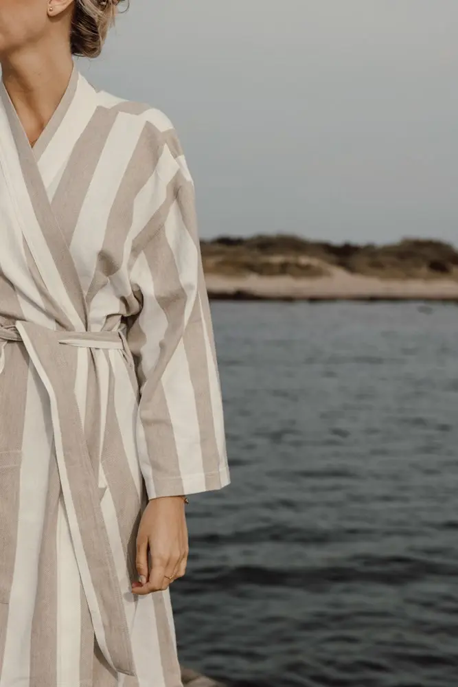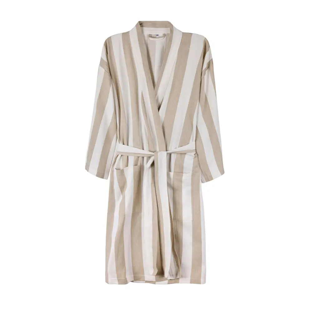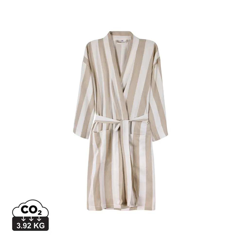 Ontdek deze zachte en comfortabele hamam badjas, ideaal voor uw marketingacties of events. Gemaakt van een lichtgewicht en luchtige mix van 200 grams, combineert hij het natuurlijke comfort van gerecycled katoen met de sneldrogende eigenschappen van gerecycled polyester. De klassieke stijl met gestreept patroon, nette kraag, voorzakken, 3/4 mouwen en tailleband zorgt voor een perfecte pasvorm en een professionele uitstraling.