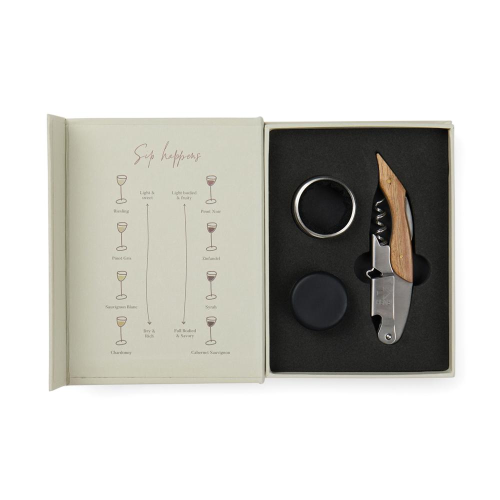 Ga op een verfijnde reis met de Story of Wine set, elegant verpakt in een geschenkdoos die lijkt op een klassiek boek. Deze set bevat een kurkentrekker, een siliconen flessendop om je wijn langer vers te houden en een druppelstop om drupvrij te schenken. De unieke verpakking beschermt niet alleen je wijnaccessoires, maar vertelt ook een boeiend verhaal over wijn, waardoor het een perfect cadeau is voor wijnliefhebbers. De geschenkdoos is gemaakt van FSC® gecertificeerd papier.