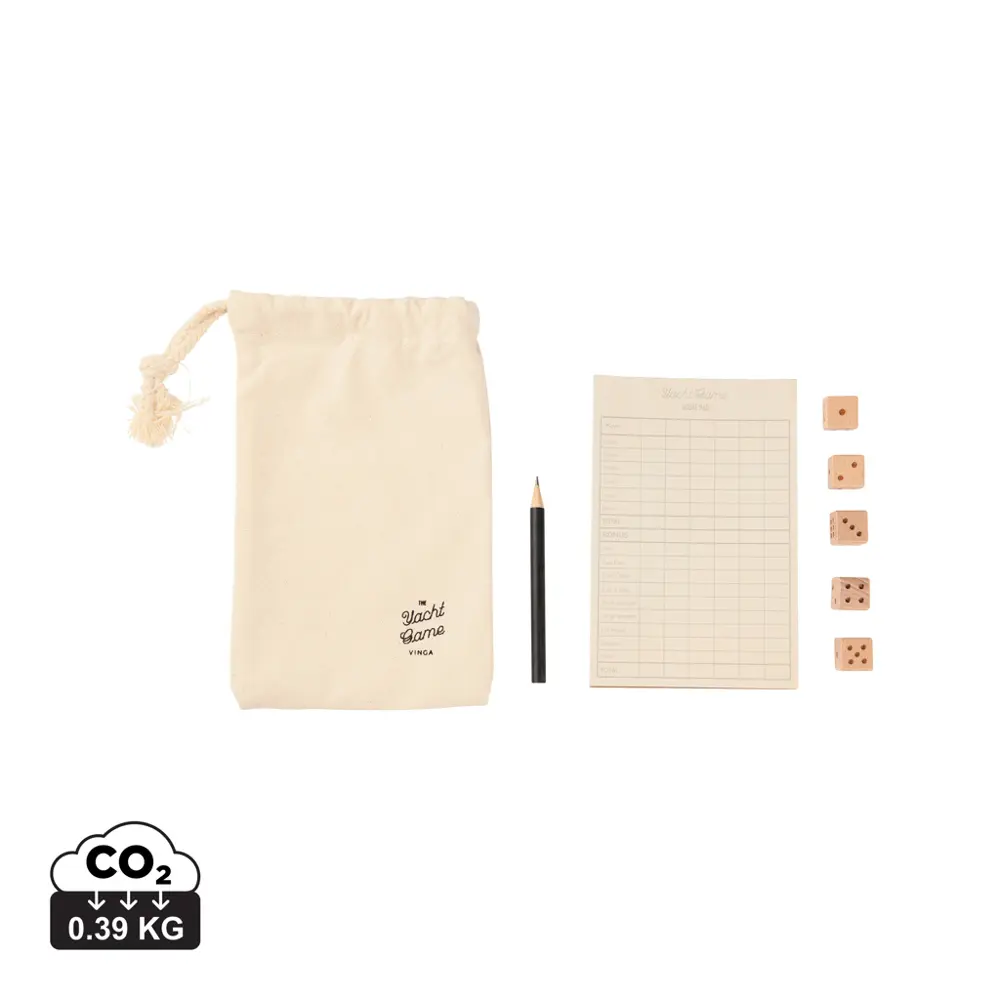 Ontdek de VINGA Yacht game, een tijdloos dobbelsteenspel dat uw merk zichtbaar maakt tijdens events, picknicks of teambuilding. Met vijf FSC®-gecertificeerde grenen dobbelstenen, een notitieblokje en pen, alles verpakt in een handige katoenen zak, biedt dit spel eenvoudige spelregels voor maximaal plezier en interactie. Personaliseer het met uw logo voor een uniek relatiegeschenk dat ontspanning combineert met promotie. Ideaal voor marketingacties: stimuleert gesprekken, versterkt relaties en benadrukt uw engagement voor duurzaamheid dankzij FSC®-hout. Neem het overal mee en laat uw klanten scoren met uw branding.
