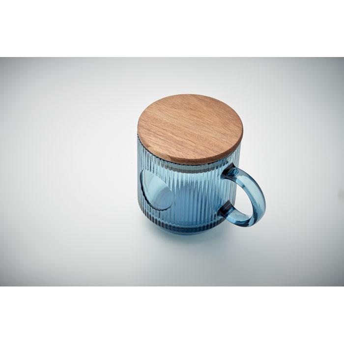 Ontdek deze stijlvolle geribbelde glazen mok met acaciahouten deksel en een inhoud van 300 ml. Perfect als gepersonaliseerd relatiegeschenk voor jouw events of marketingcampagnes.