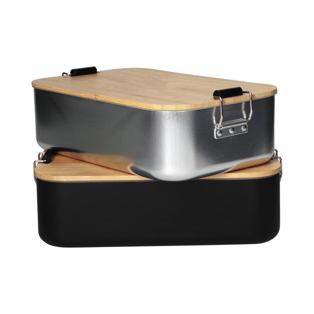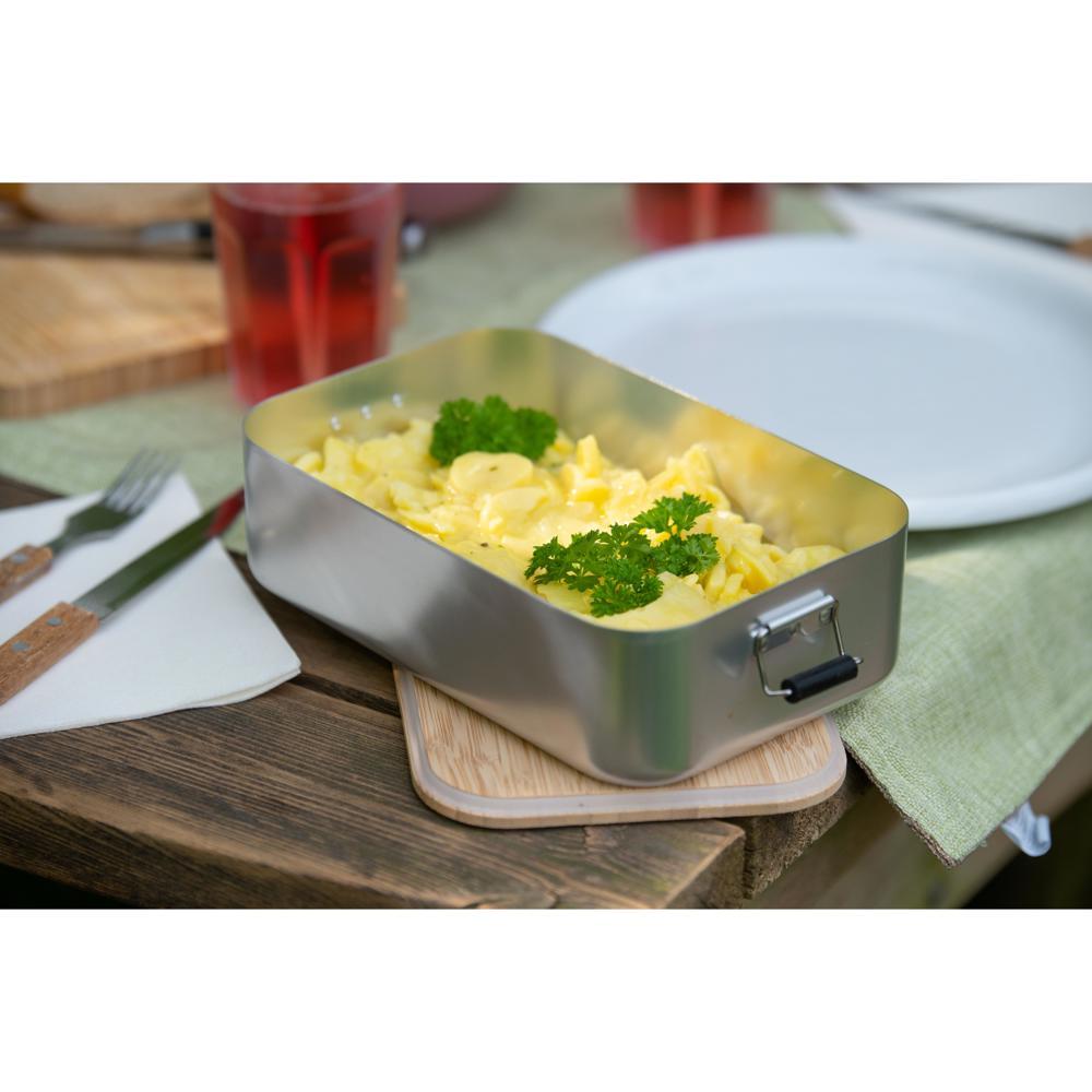 Je kiest met deze grote, plasticvrije voorraadbus "Bamboe" voor een duurzaam promotiegeschenk dat indruk maakt op je klanten. Gemaakt van licht aluminium met een bamboe deksel, siliconenring en stevige klembeugels voor een luchtdichte afsluiting, blijft al je eten vers en veilig. Het volledig afneembare deksel fungeert ook als handige snijplank, ideaal voor onderweg of op events.