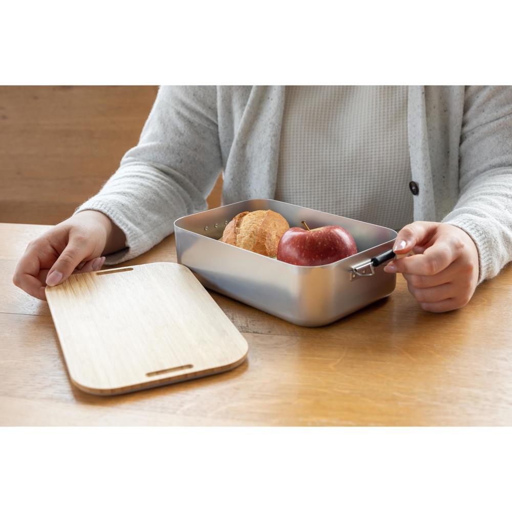 Ontdek deze duurzame voorraadbus als ideaal gepersonaliseerd relatiegeschenk voor je marketingacties en events. Gemaakt van licht aluminium met een bamboe deksel, biedt hij een lekvrije afsluiting dankzij de siliconenring en stevige klembeugels. Het volledig afneembare deksel fungeert ook als handige snijplank, perfect voor onderweg.