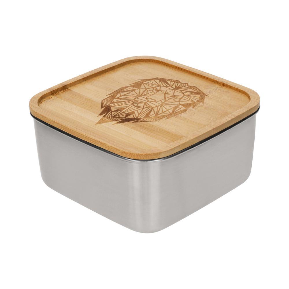 Je ontdekt de Voorraadbus "Vesper", groot: een stijlvolle lunchbox met roestvrijstalen schaal en bamboehouten deksel, stevig vastgehouden door een elastische band. Perfect om voedsel vers te bewaren en eenvoudig mee te nemen naar kantoor, events of onderweg.
