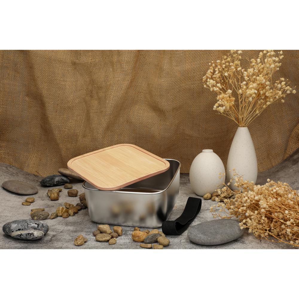 Ontdek deze stijlvolle gepersonaliseerde lunchbox met een schaal van roestvrij staal en een elegant deksel van bamboehout. Een elastische band houdt alles stevig bij elkaar, ideaal om je maaltijden vers te bewaren en mee te nemen naar kantoor, events of onderweg.