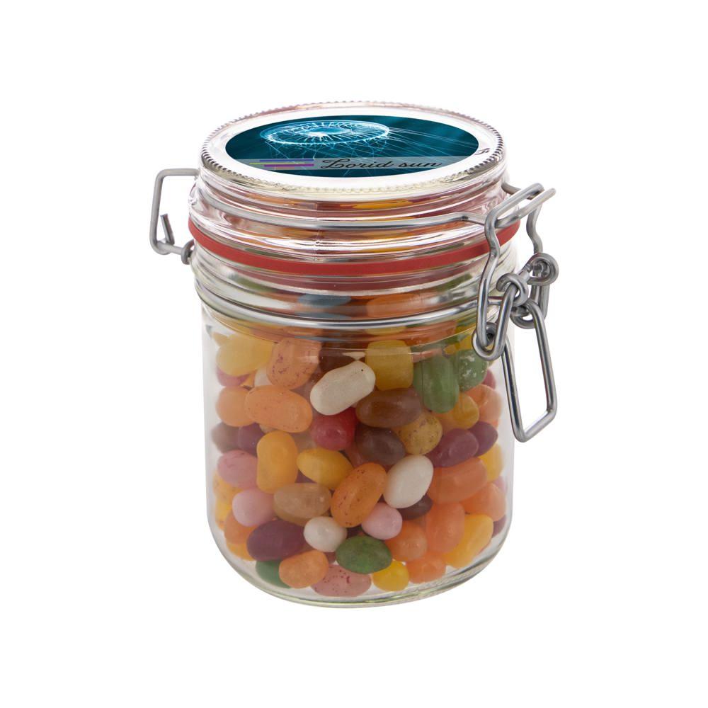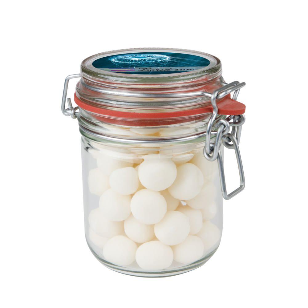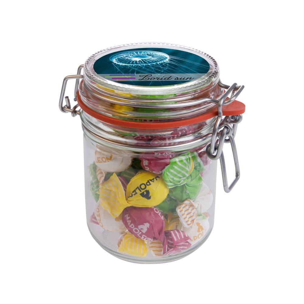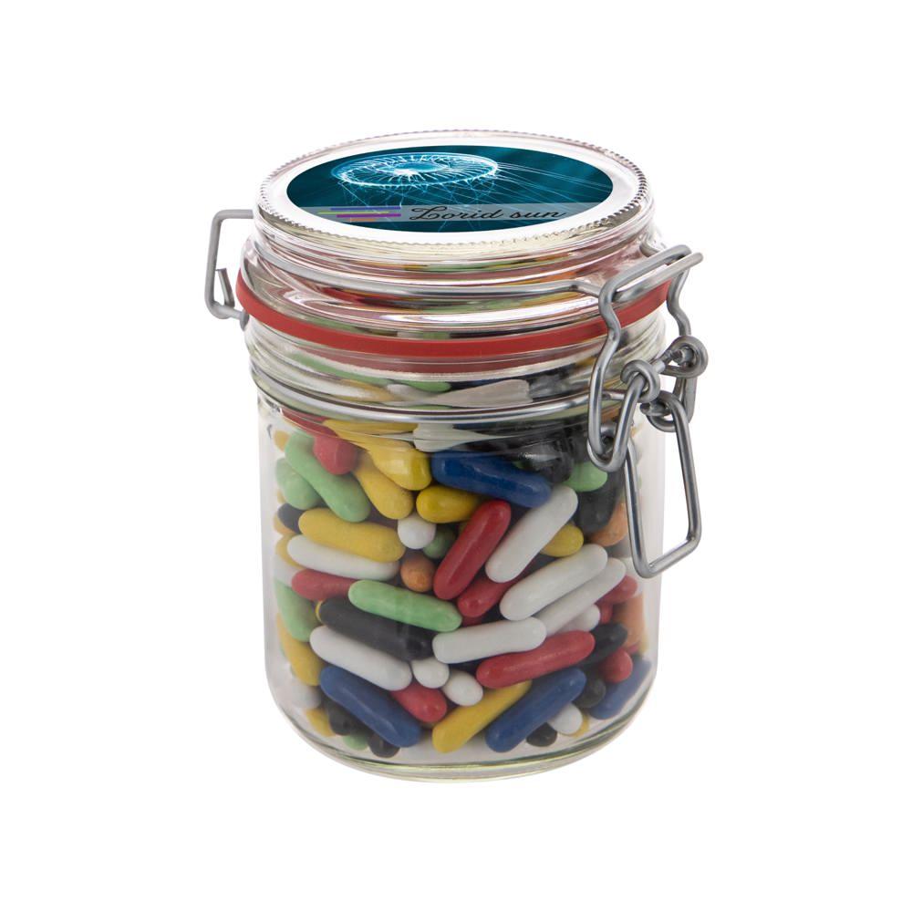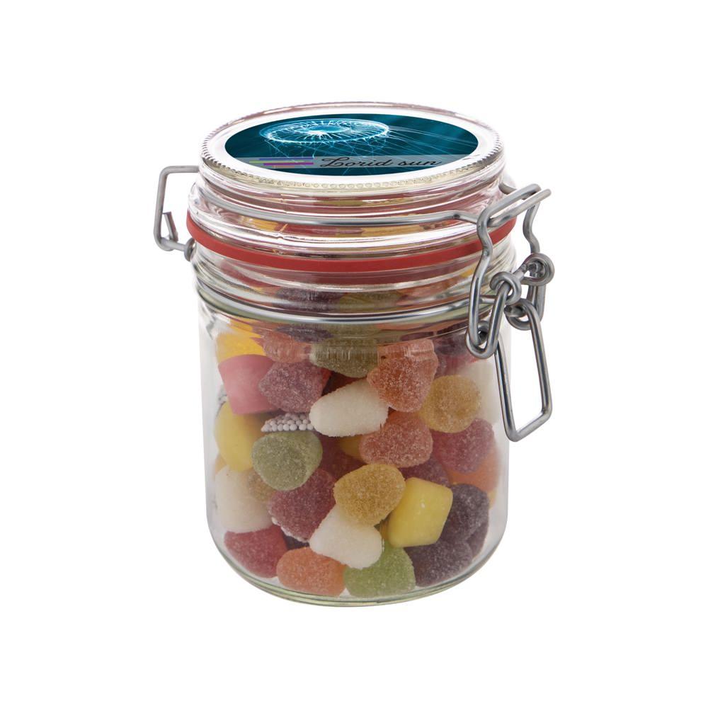 Dit weckpotje 0,4 liter gevuld met snoep is jouw ideale relatiegeschenk voor events en promoties. Je krijgt een handig potje met diameter 75 mm, gevuld met circa 140 gram metallic sweets, en een full colour sticker op het deksel voor jouw logo of boodschap.